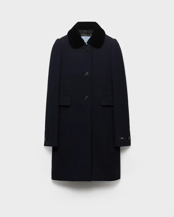 厳格なエレガンスを湛えるこの一着は、ストレートなシルエットと仕立ての細部に特徴があります。ラウンドネック、フラップポケット、ハーフベルトがシルエットを際立たせ、取り外し可能なベルベットカラーが洗練された汎用性を添えています。