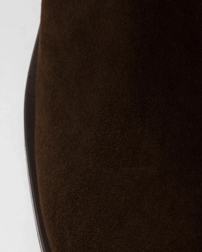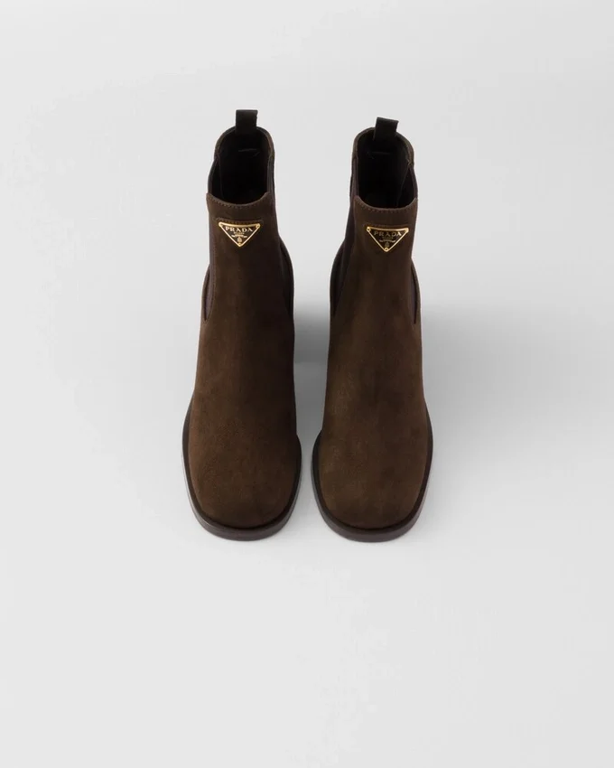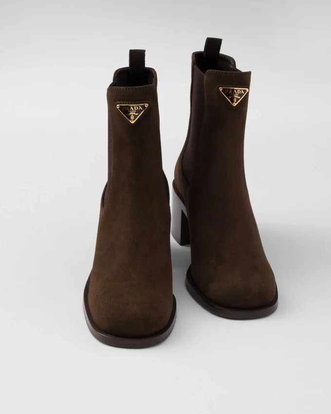 このスエードブーティは、すっきりとしたラインが特徴の洗練された汎用性の高いデザインです。エナメル加工された金属製の三角ロゴが、その滑らかで独特なシグネチャーとしてスタイルを引き立てています。