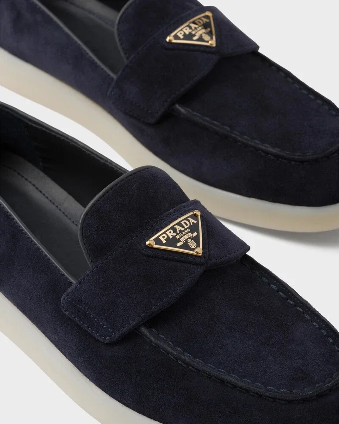 このスエードレザーのローファーはクラシックな魅力を放ち、アッパーのピンチステッチが特徴です。前面にはエナメル加工された金属製の三角ロゴが際立っています。