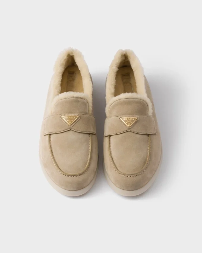 すっきりとしたラインとモダンなシルエットのこのスエードローファーは、柔らかなシープスキンの裏地が施され、特徴的なトライアングルロゴがあしらわれています。