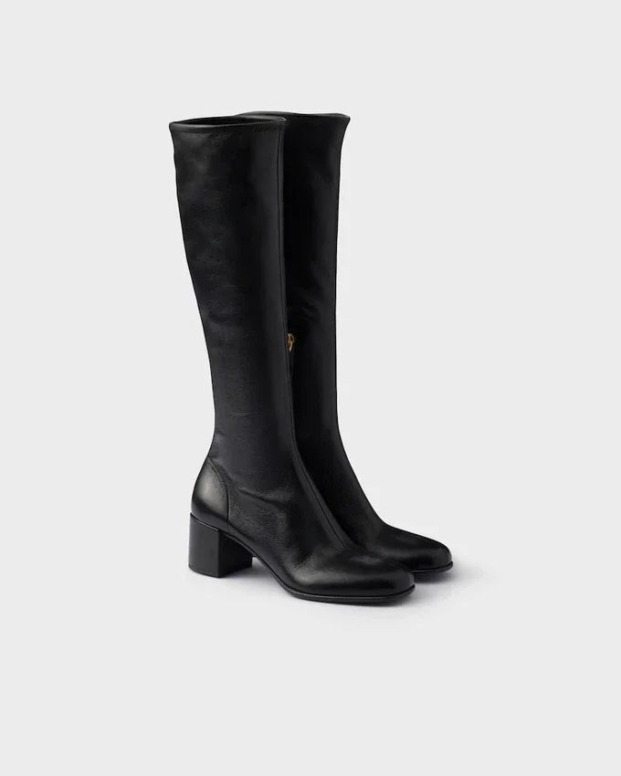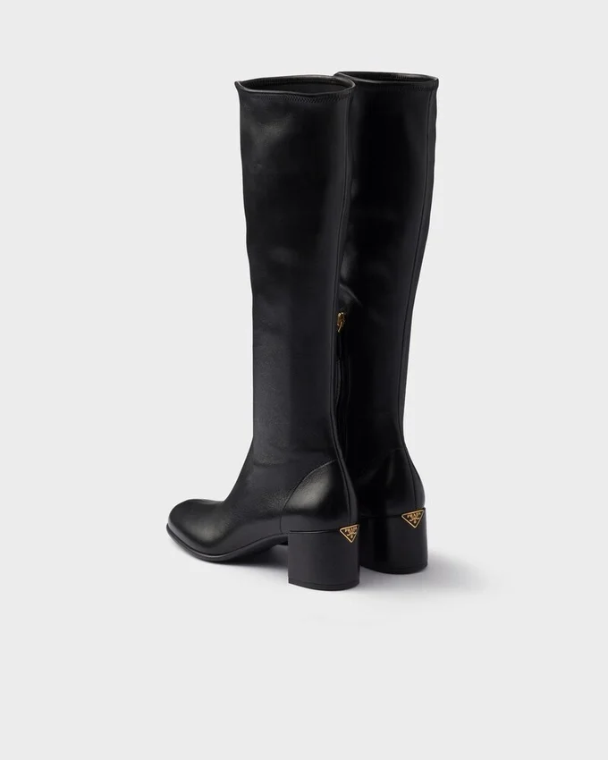 スクエアヒールをあしらった、洗練されたテーパードシルエットが特徴のブーツです。ストレッチナッパレザーの柔らかくしなやかな質感が、サイドジッパーの開閉と象徴的な三角ロゴの装飾を際立たせ、洗練された統一感のあるスタイルを演出します。