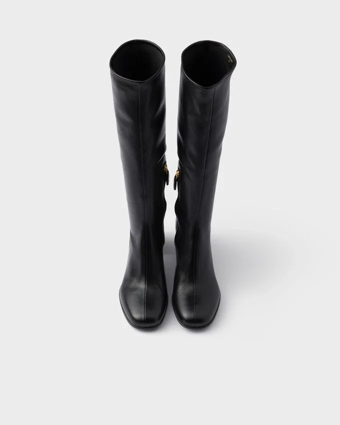 スクエアヒールをあしらった、洗練されたテーパードシルエットが特徴のブーツです。柔らかくしなやかなストレッチナッパレザーの質感が、サイドジッパーの開閉機構と象徴的な三角ロゴの装飾により、洗練された統一感のあるスタイルを演出しています。