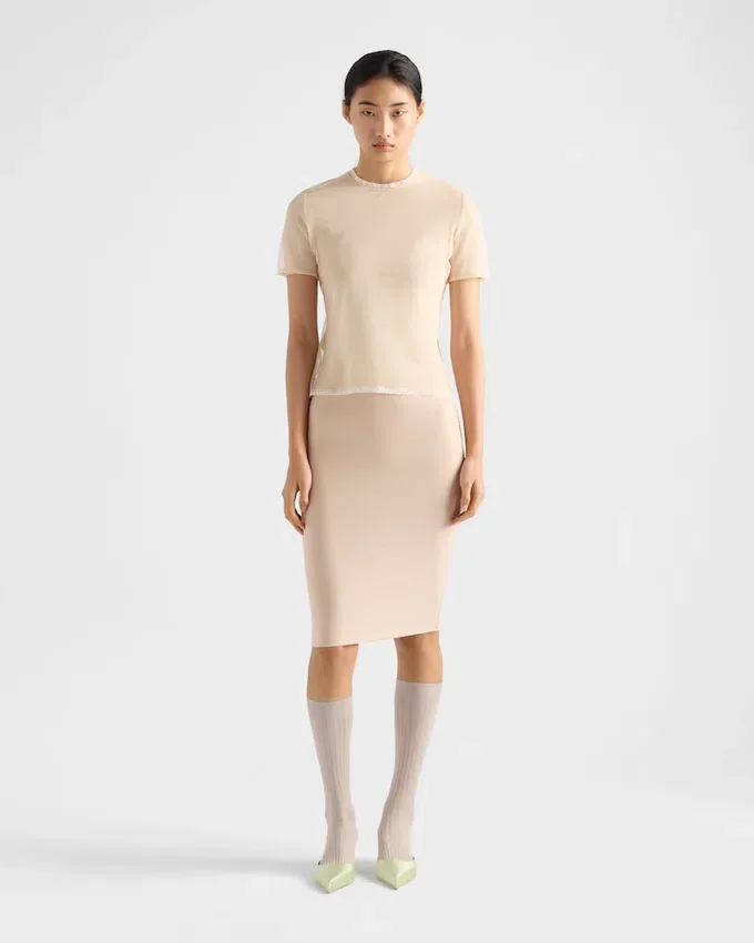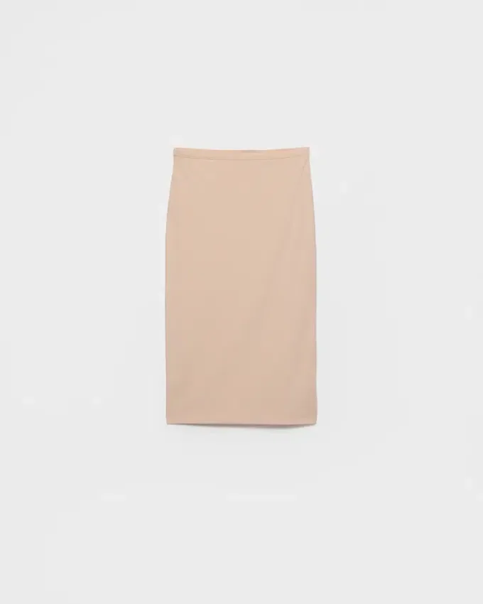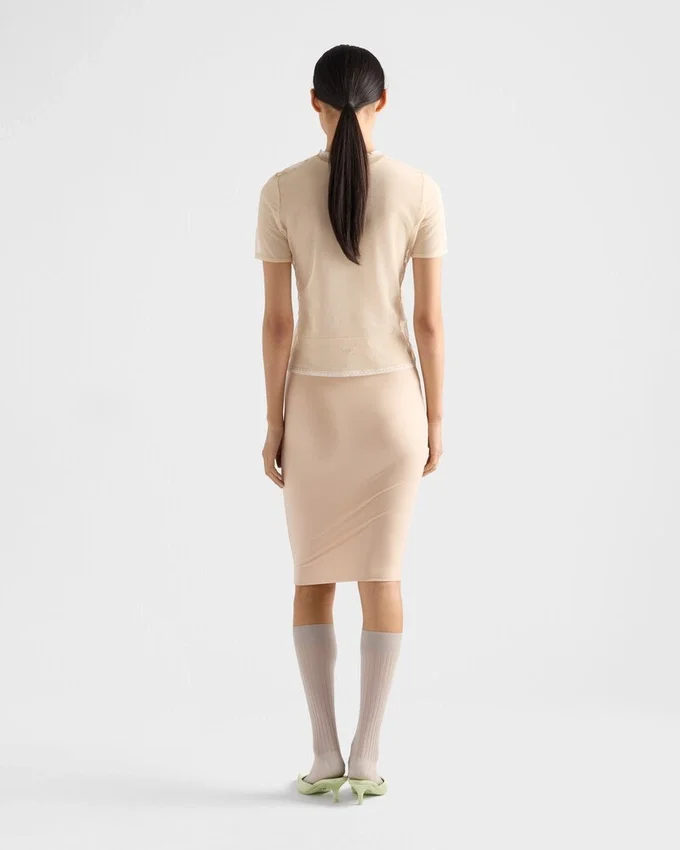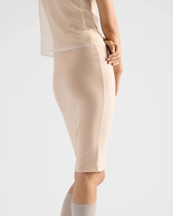 このストレッチ素材のスリップは、スリムフィットで洗練されたペンシルシルエットが特徴です。軽やかなデザインには、象徴的なエナメル加工のメタルトライアングルロゴがあしらわれています。