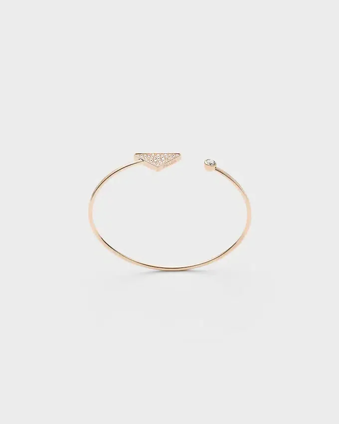1913年にマリオ・プラダの旅行用トランクに刻印として初めて登場し、今やこのファインジュエリーコレクションの主役となった、象徴的なトライアングルの表面を、パヴェダイヤモンドが彩り、輝きを放ちます。 リサイクルイエローゴールドで作られたこのバングルブレスレットでは、並置されたダイヤモンドが独自の光の戯れを生み出し、ラインの優雅さと、ユニークなデザインを生み出す職人技を際立たせています。先端にセットされたダイヤモンドが、このジュエリーのデザインをさらに引き立てています。