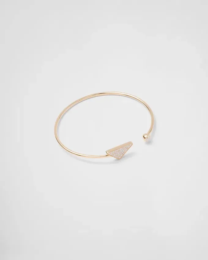 1913年にマリオ・プラダの旅行用トランクに刻印として初めて登場し、現在ではこのファインジュエリーコレクションの主役となっている象徴的なトライアングルの表面を、パヴァ・セッティングのダイヤモンドが彩り、輝きを放っています。 リサイクルイエローゴールドで作られたこのバングルブレスレットでは、並置されたダイヤモンドが独自の光の戯れを生み出し、ラインの優雅さと、ユニークなデザインを生み出す職人技を際立たせています。先端にセットされたダイヤモンドが、このジュエリーのデザインをさらに引き立てています。