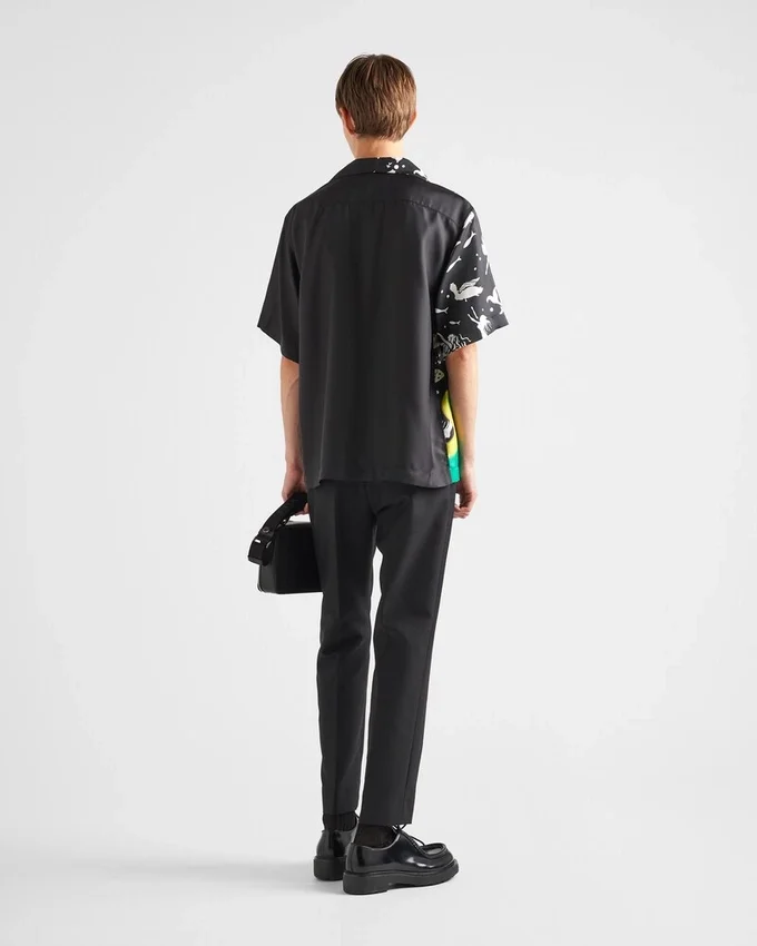 鮮やかなグラフィックのコントラストが特徴のダブルマッチシャツ。ブランドを象徴する二面性と対比がデザインに息吹を与えています。スポーティーなオーバーサイズフィットで仕立てられたこのシルクツイルのアイテムは、特徴的なボウリングカラーが際立っています。 シャツの半分はアーカイブプリントで彩られています。胸ポケットにプリントされたトライアングルロゴが、レトロな魅力を添えてシルエットを完成させます。