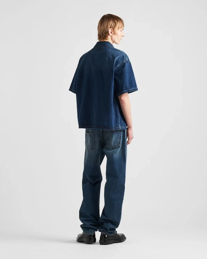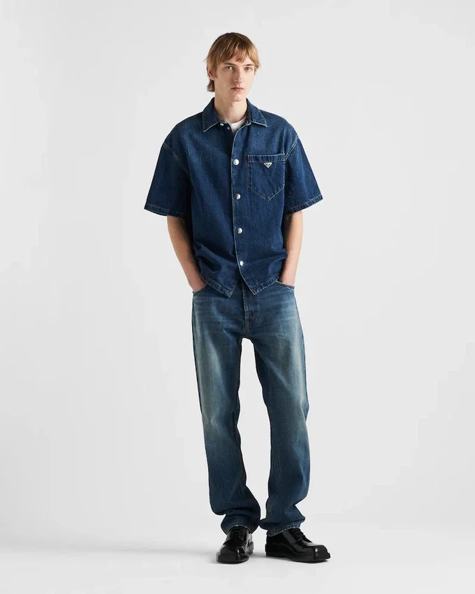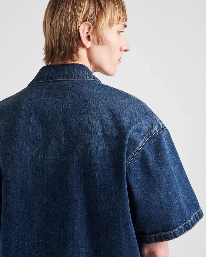オーバーサイズでモダンなスタイルのこのデニムシャツは、ユーズドデニム加工が施され、ユニークで洗練されたヴィンテージルックを演出しています。ショートスリーブのボックスシルエットはスナップボタンで留めるデザインで、カジュアルかつモダンな印象を与えます。胸ポケットに配されたエナメル加工のメタル製三角ロゴが、アイコニックなシグネチャーとしてルックを完成させます。