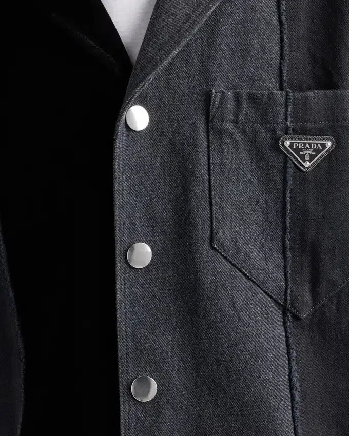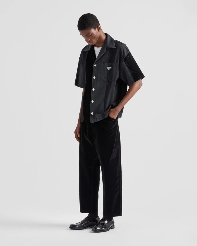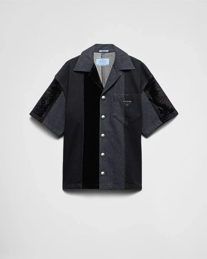 特徴的なボウリングカラーのシャツが、パッチワークのモチーフとモダンなテイストを纏ったデニム素材で再解釈され、スポーティなシルエットに新たな表情を与えています。