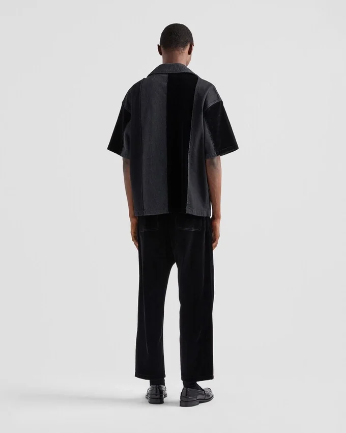 ボウリングカラーが特徴的なシャツを、パッチワークのモチーフとモダニズム的な要素を加えてデニムで再解釈し、スポーティーなシルエットに新たな個性を与えています。