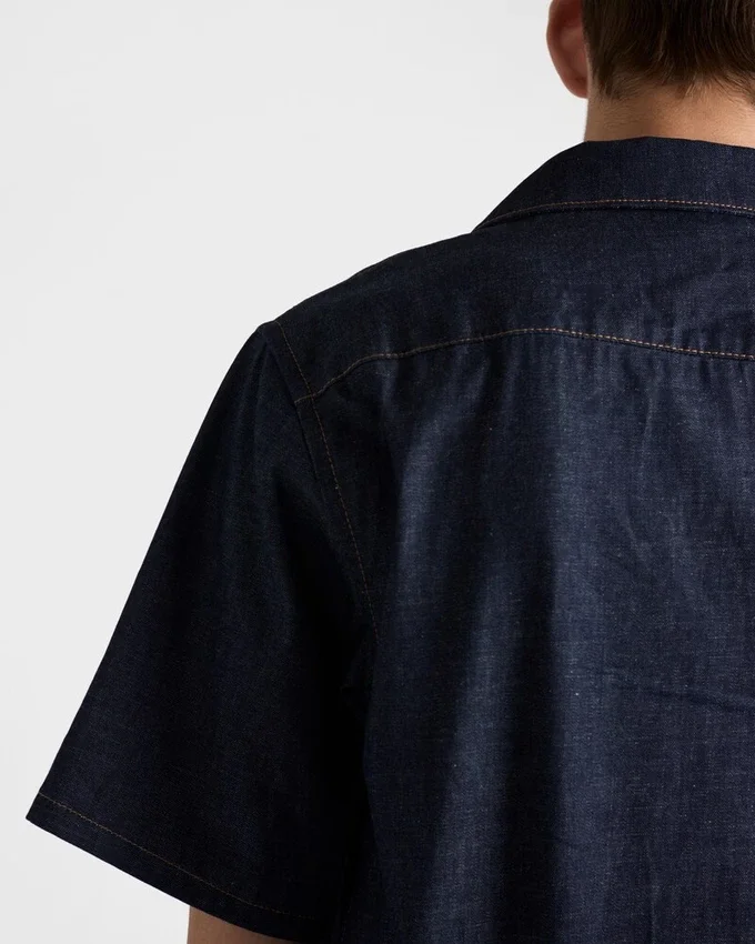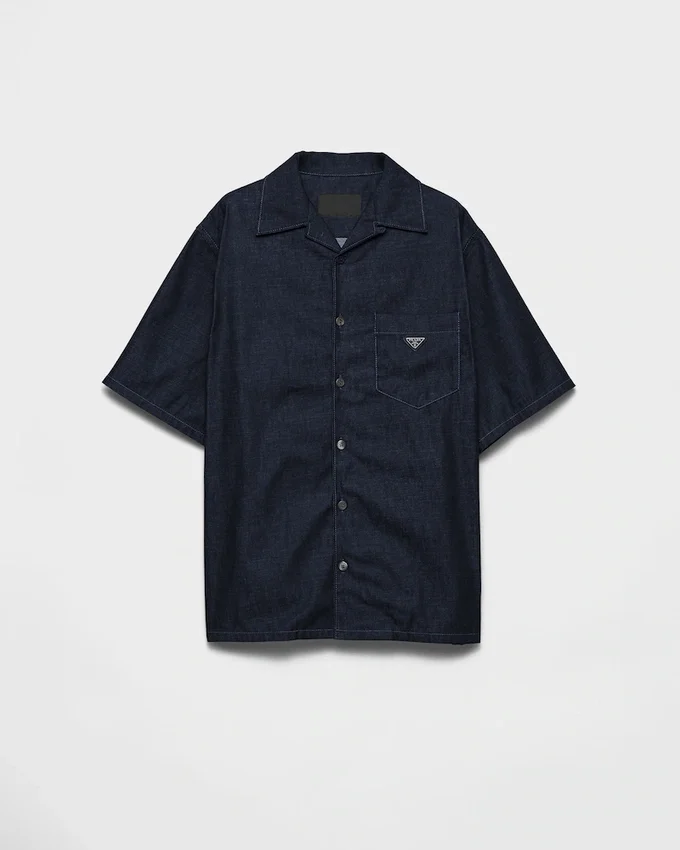 Pradaのワードローブの定番であるボウリングシャツは、毎シーズン、新しいディテールや素材で再解釈されています。コントラストの効いたトップステッチを施した生デニムで作られたこのスタイルは、洗練されたミニマルな魅力を放っています。