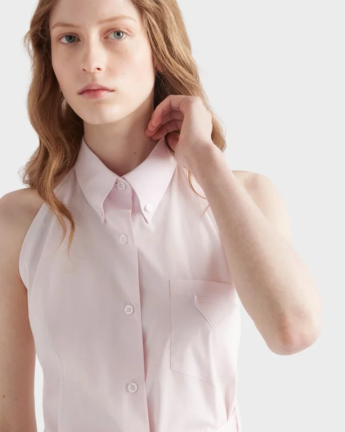このノースリーブのコットンポプリンシャツは、大胆なコントラストが特徴で、ハイブリッドなシルエットを生み出しています。 洗練されたホルターネックとクラシックなメンズウェア風の襟の組み合わせが、デザインに意外性のあるアクセントを加えています。
