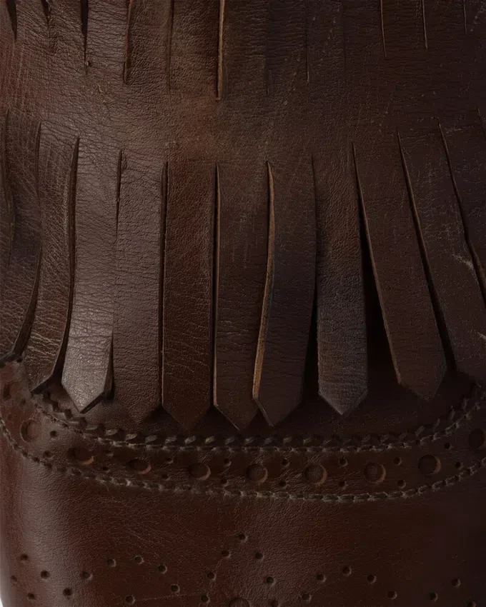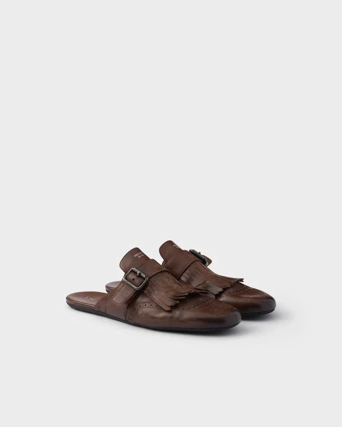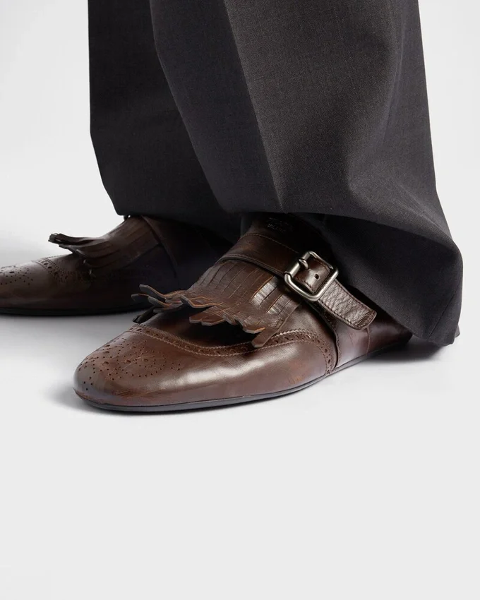 クラシックなフォーマルスタイルを再解釈したこのミュールは、柔らかくしなやかなデコンストラクテッドデザインが特徴です。洗練されたパーフォレーテッド・ブローグモチーフ、伝統的なフリンジ、アンティーク加工されたレザーが、革新的で現代的なシルエットと絶妙なコントラストを生み出しています。