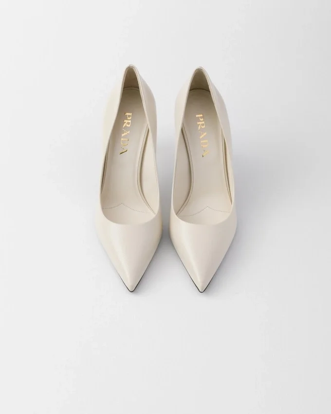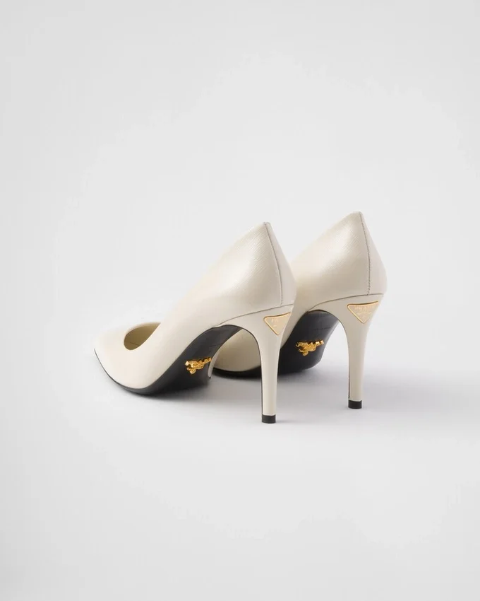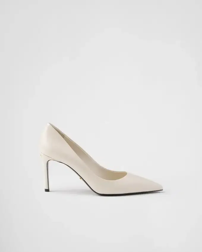 - レザーカバーヒール、エナメル加工メタルトライアングルロゴ付き、 ヒール高 85 mm