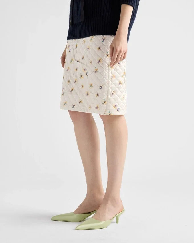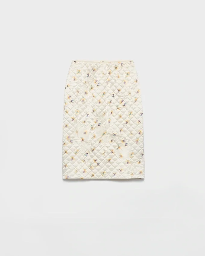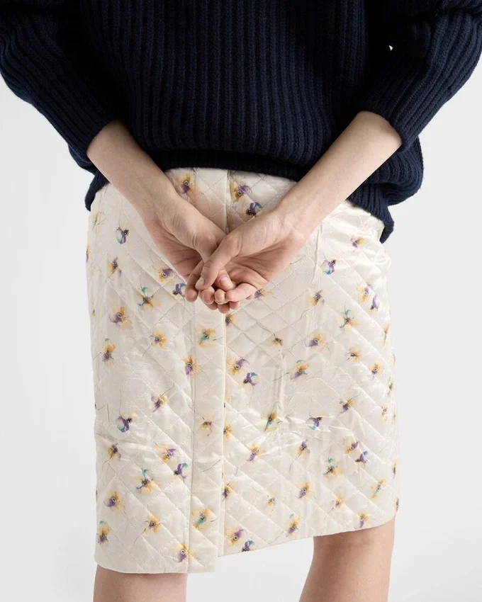キルティング加工を施したサテン地で作られたこのペンシルスカートのデザインには、ロマンティシズムとノスタルジアが融合しています。洗練されたシルエットは、ヴィンテージの魅力を添える繊細なフローラルプリントによって引き立てられています。