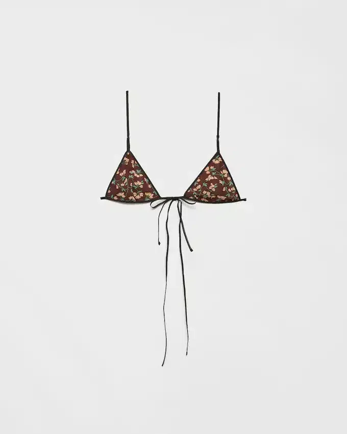 大胆かつ洗練されたデザイン:フローラルプリントのジョーゼットブラは、軽やかでしっかりとしたシルエットが特徴です。細いショルダーストラップと背中のタイ留めが、その洗練された美しさを引き立てます。
