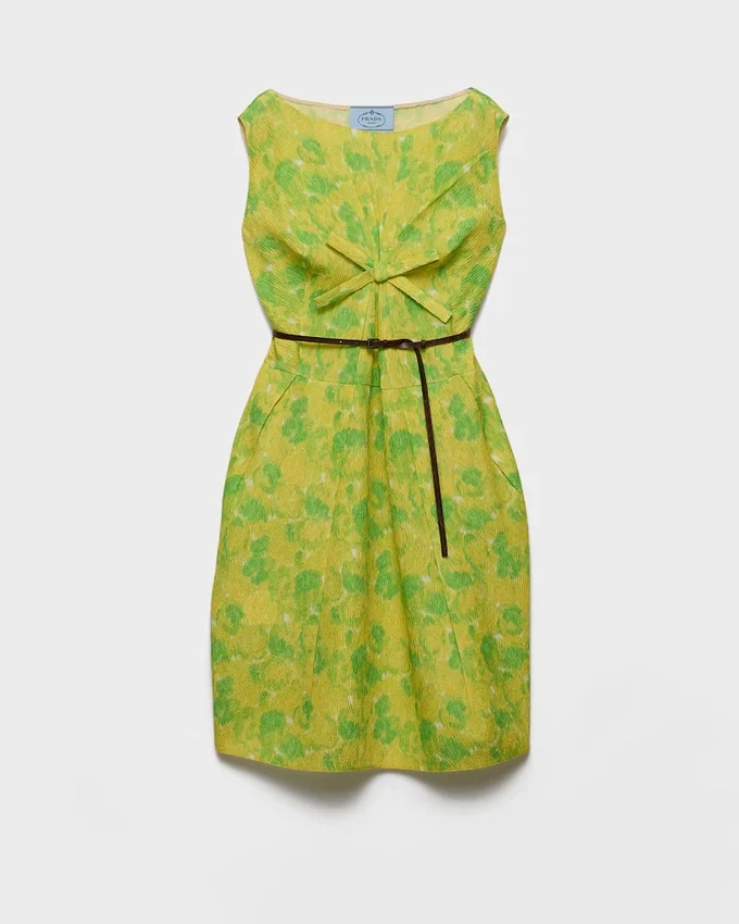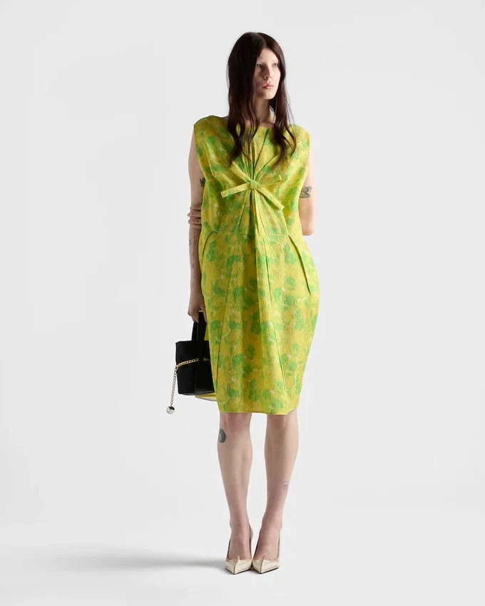 2025年秋冬コレクションは、女性らしさに対する認識に問いを投げかけ、その象徴的なアイテムを再定義します。このドレスは、ゆったりとしたシルエット、ヴィンテージの趣きを感じさせるディテール、そして蛍光色の花柄プリントを組み合わせ、型にはまらないモダンなエレガンスを表現しています。