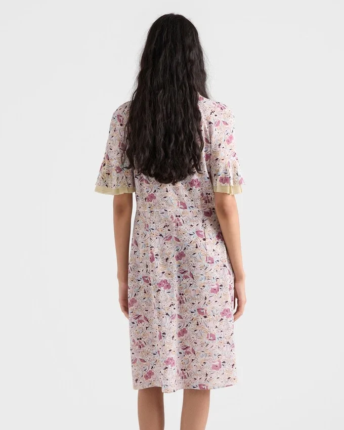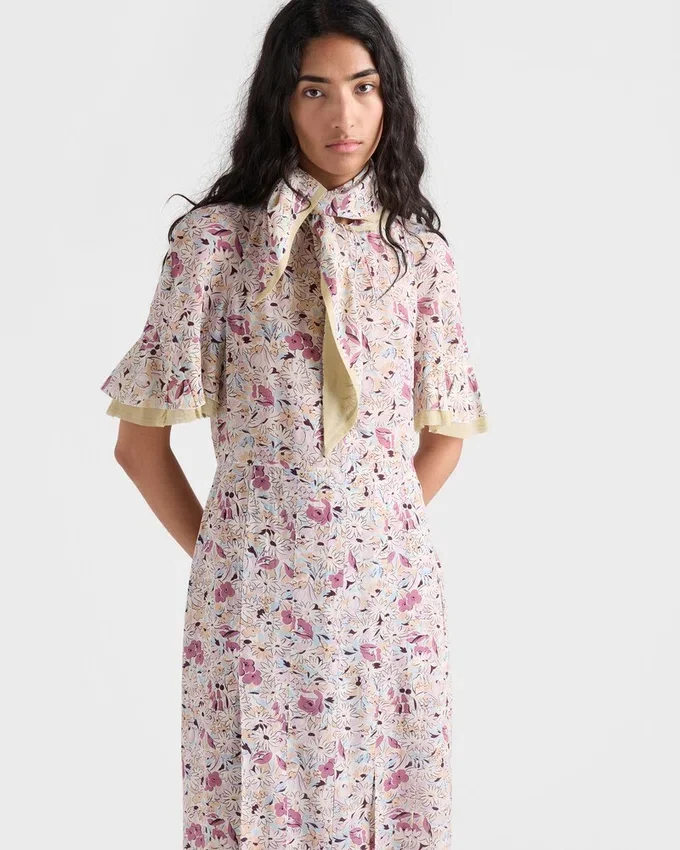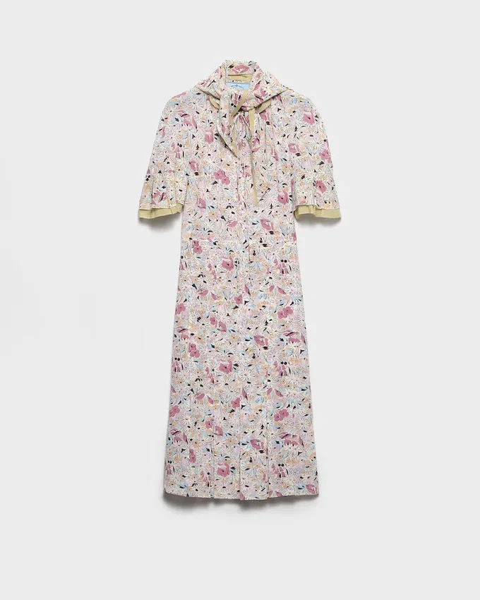 レトロな魅力と現代的な要素を融合させたこの洗練されたジョーゼットドレスは、流れるようなダイナミックなシルエットとフェミニンなディテールが特徴です。上品なフローラルプリントがショートスリーブのスタイルに彩りを添え、様々な着こなしが楽しめる同色のスカーフが付属しています。