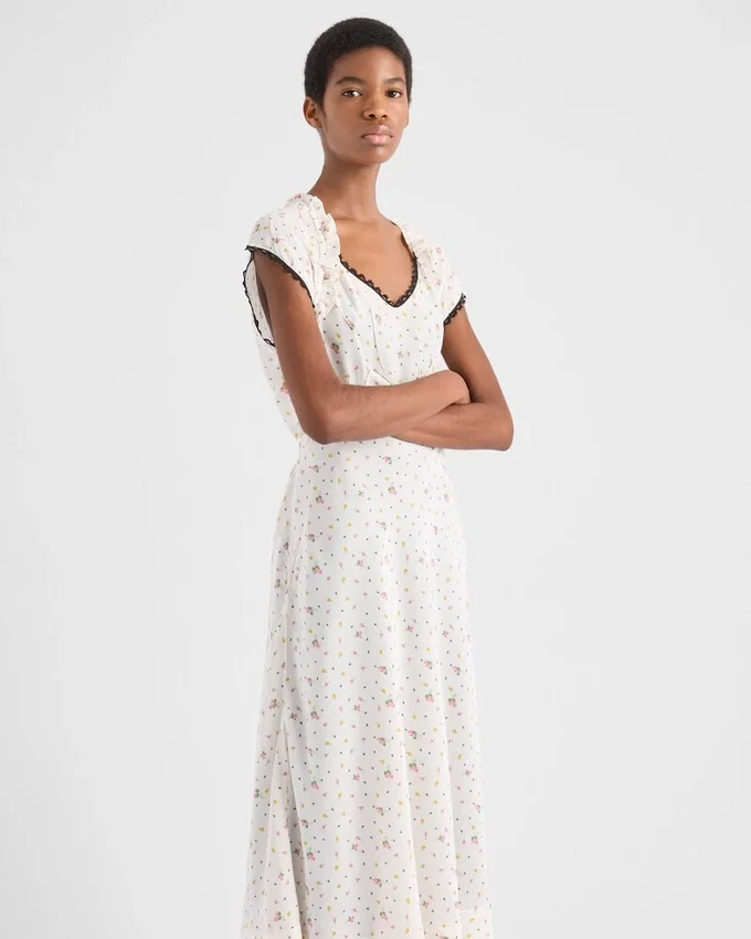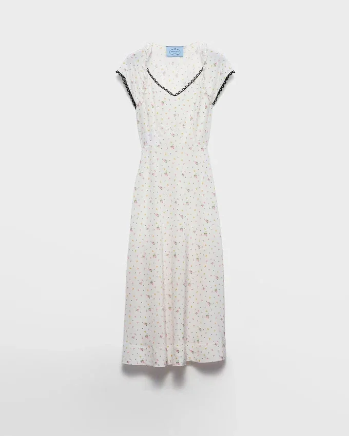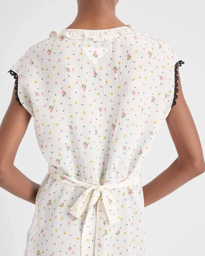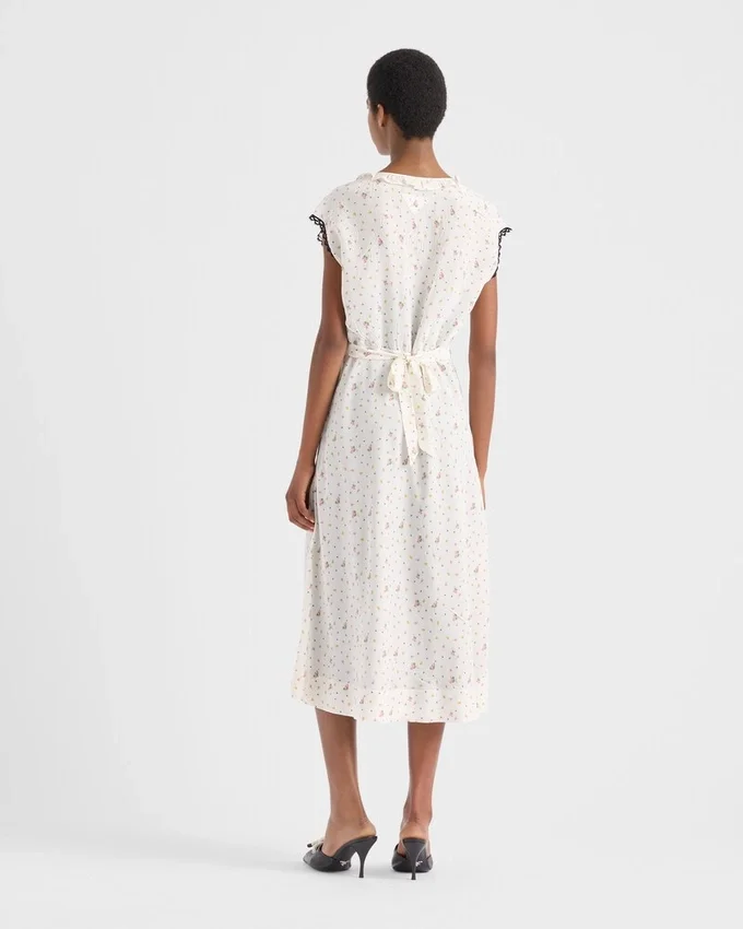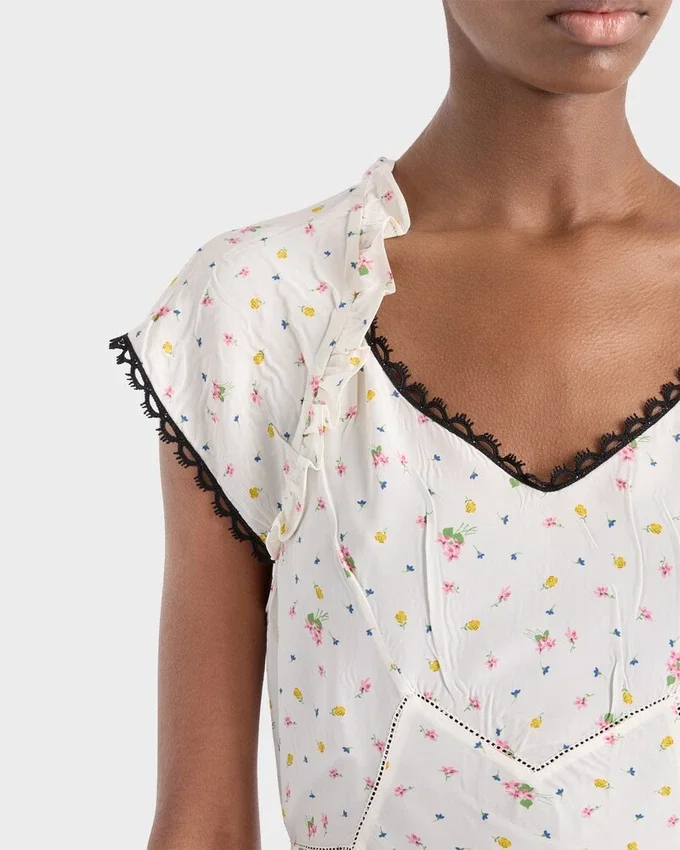 この繊細でロマンチックなポンガ素材の半袖ドレスは、ヴィンテージの魅力を感じさせる軽やかなシルエットが特徴です。マイクロフローラルプリントが躍動感を与えるこのスタイルは、袖とVネックラインの縁取りに施されたルーチングとマクラメレースのトリムで装飾されています。