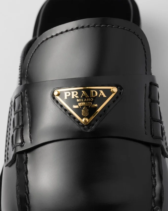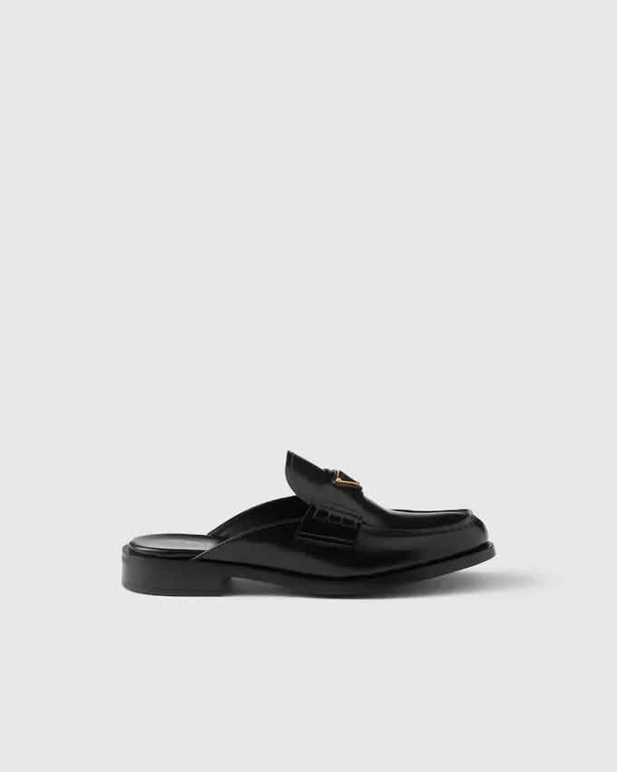 ハイブリッドなシルエットのこのブラッシュドレザーミュールは、フォーマルなエレガンスと現代的なカジュアルな雰囲気を融合させています。洗練された職人技のディテールが、トライアングルロゴをあしらったラバーソールを備えたこの万能なシューズをさらに引き立てています。