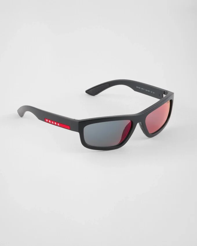 スポーティーで現代的なデザインのサングラス。超軽量のナイロンファイバー製フレームは、わずかにカーブした長方形のフロントと、プラダ リネア・ロッサのロゴをあしらった幅広のテンプルが特徴です。