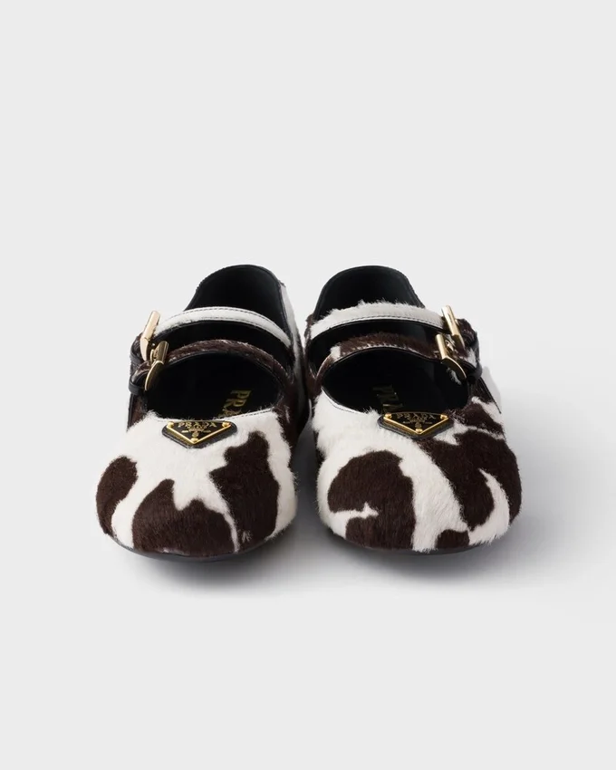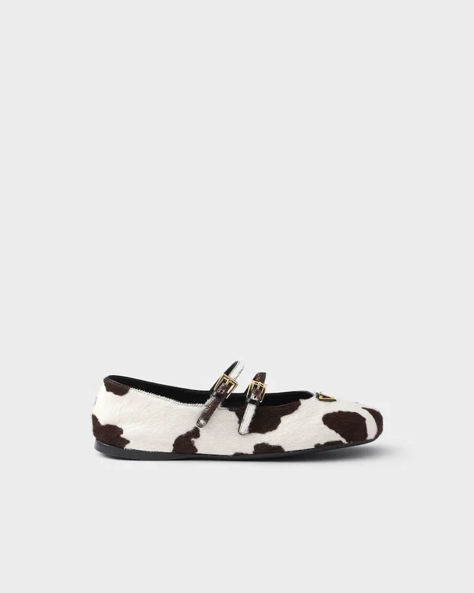 エレガントでフェミニンな魅力を持つこのレザーバレリーナシューズは、アニマルプリントがアクセントになっています。クラシックなラインと洗練されたディテールが特徴のラウンドトゥシューズは、ダブルストラップとラバーソールを備え、エナメル加工されたメタル製の三角ロゴがアクセントになっています。
