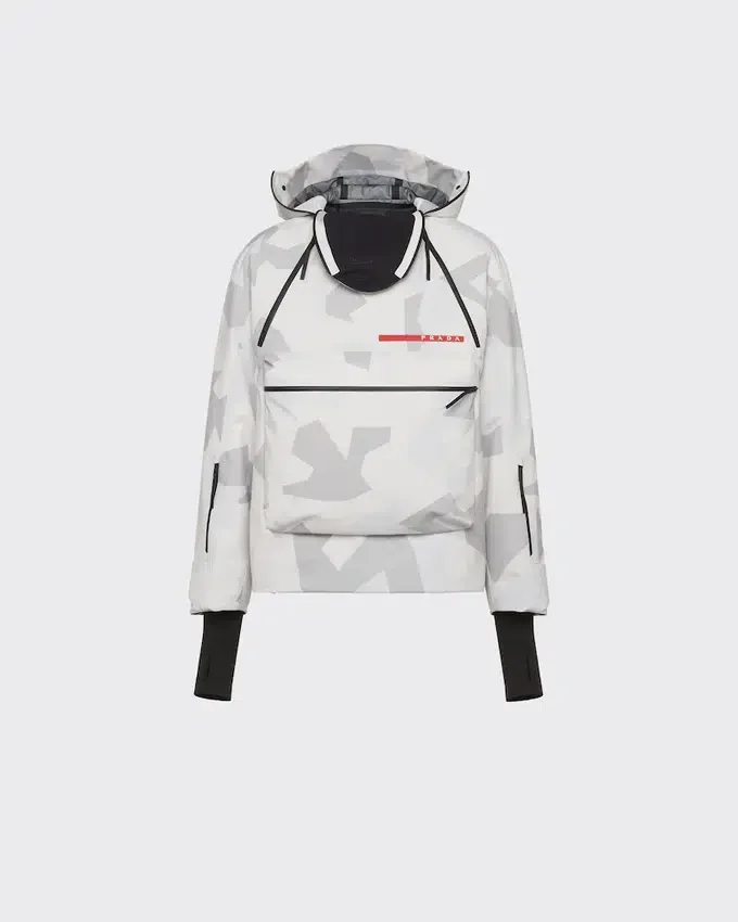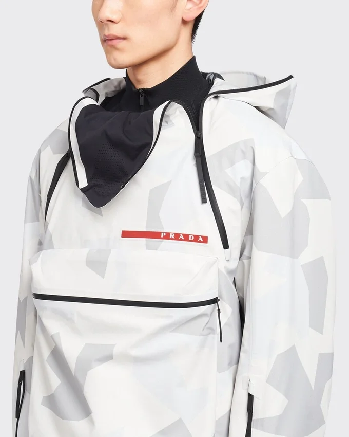 雪景色をモチーフにした北極カモフラージュ柄のプリントが施されたこのスノーボードジャケットは、テクニカルファブリック(3層ボンディングポリエステル素材)を使用しています。優れた防水・防風性能と最適な通気性を確保するよう設計されています。プラダ リネア・ロッサの象徴的なラテックスラバー製ロゴラベルが、ジャケットを彩っています。