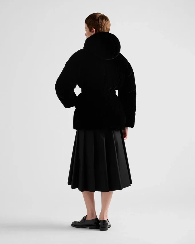 この汎用性の高いモダンなベルベットダウンジャケットは、ウエストを強調する伸縮性のあるバンドが特徴で、象徴的なトライアングルロゴがあしらわれています。