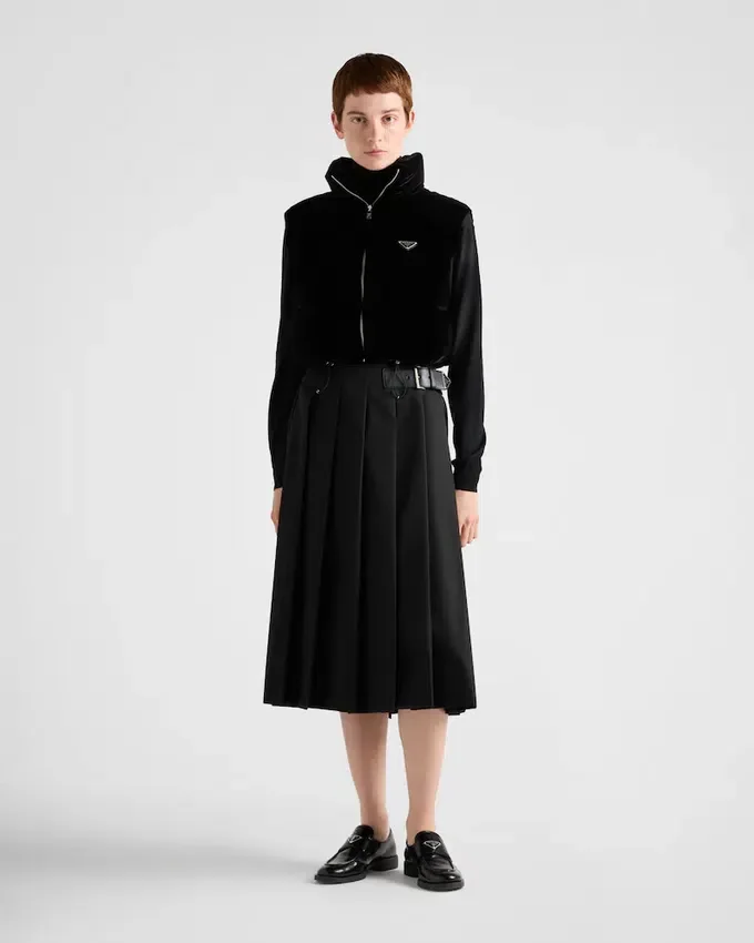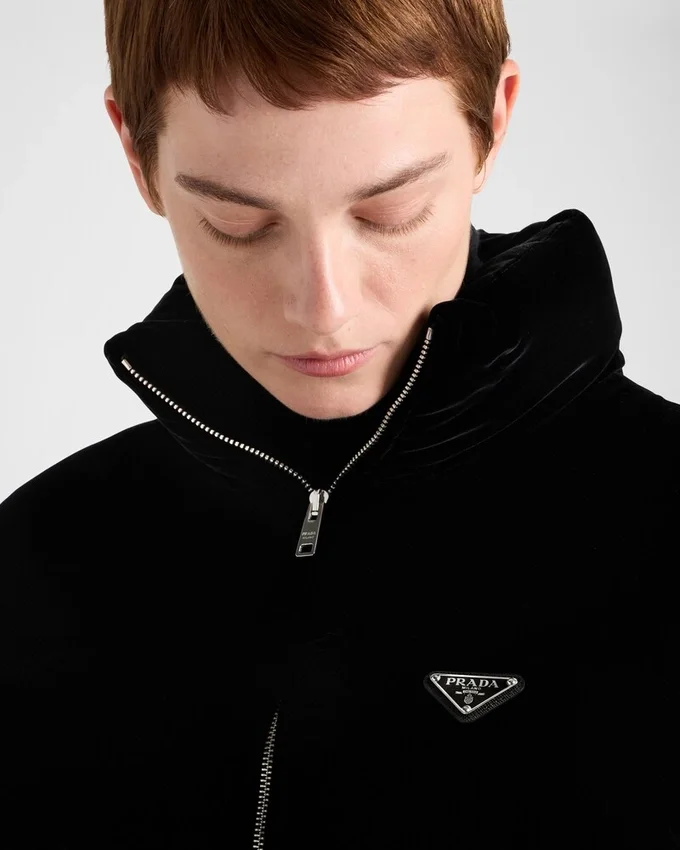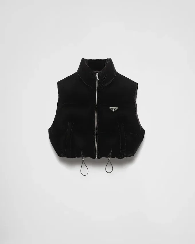 柔らかなボリューム感とスポーティーで機能的な特徴を持つこのベルベットダウンベストは、象徴的なトライアングルロゴがあしらわれています。