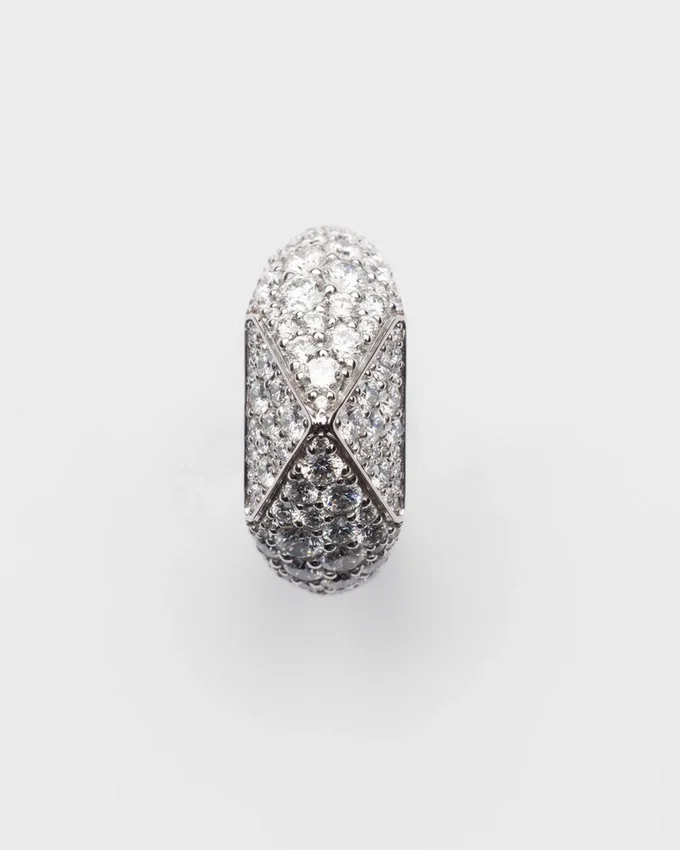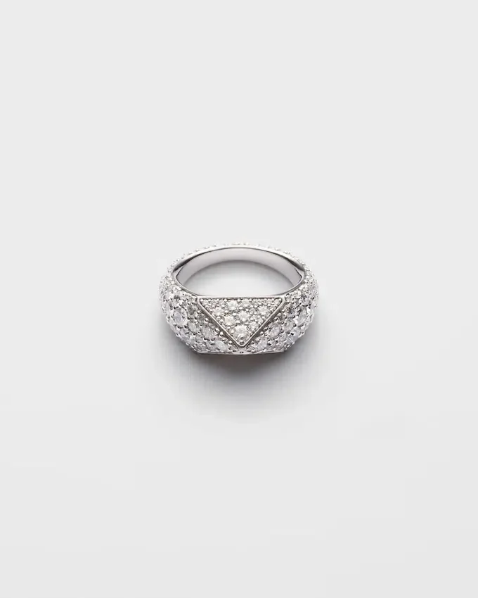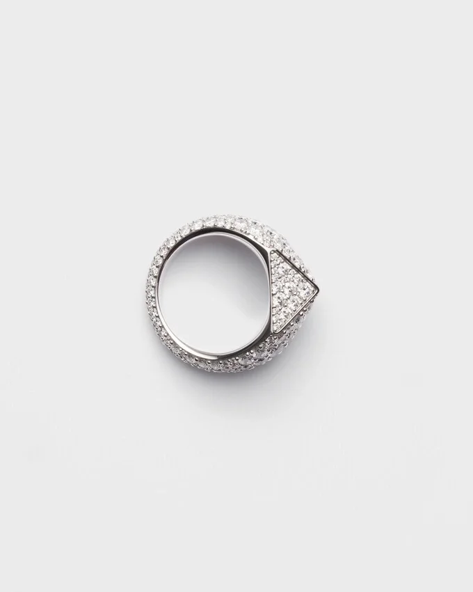 「エターナル・ゴールド」コレクションは、原型的なフォルムと永遠のシンボルとの対話を紡ぎ出します。Prada Triangleという象徴的な幾何学的な形が、パヴァ・セッティングのダイヤモンドをあしらったこのホワイトゴールドのリングの主役となっています。力強く立体的なラインが、現代的で個性的なジュエリーを生み出し、革新と卓越した職人技の調和を表現しています。