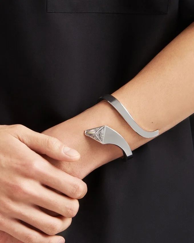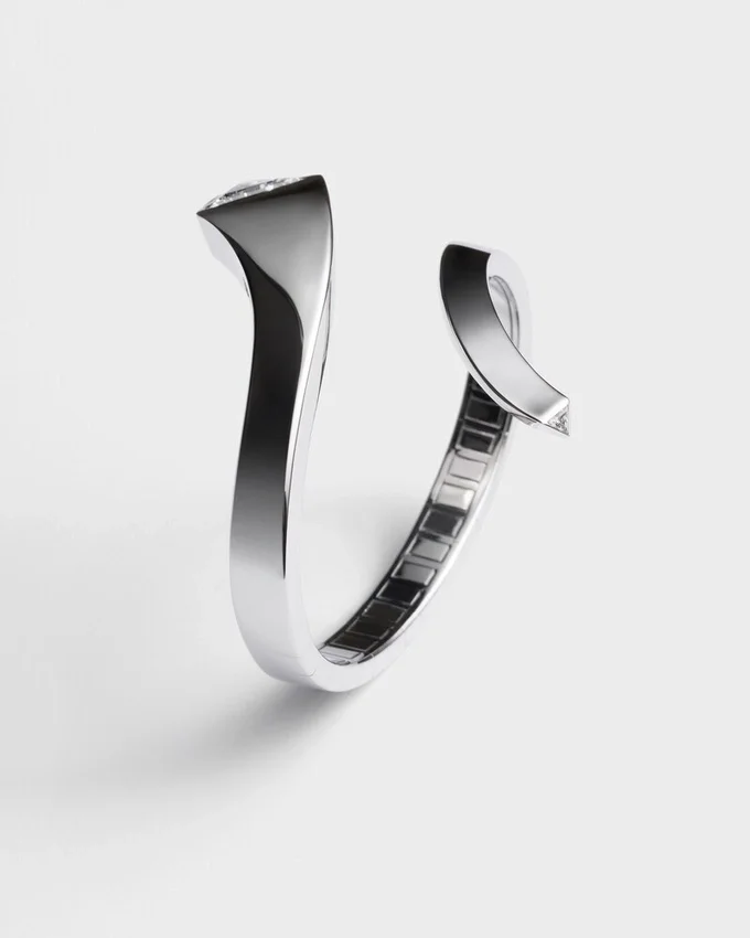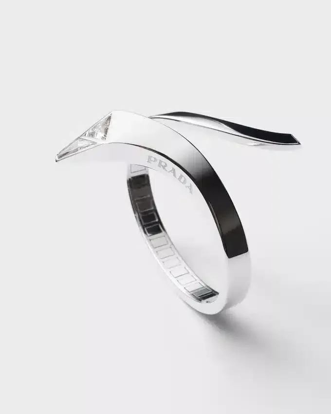 「エターナル・ゴールド・ジュエルズ」は、技術革新と職人の伝統を融合させた型破りなアプローチで、ジュエリーの常識を再定義します。 卓越性と進歩の象徴である新しいprada・カット・ダイヤモンドが、リサイクル・ホワイトゴールド製のこのバングル・ブレスレットのシルエットを輝かせます。Pradaの作品に内在する二面性を表現する「スネーク」は、力強く現代的なスタイルで、しなやかなラインを用いて再解釈されています。