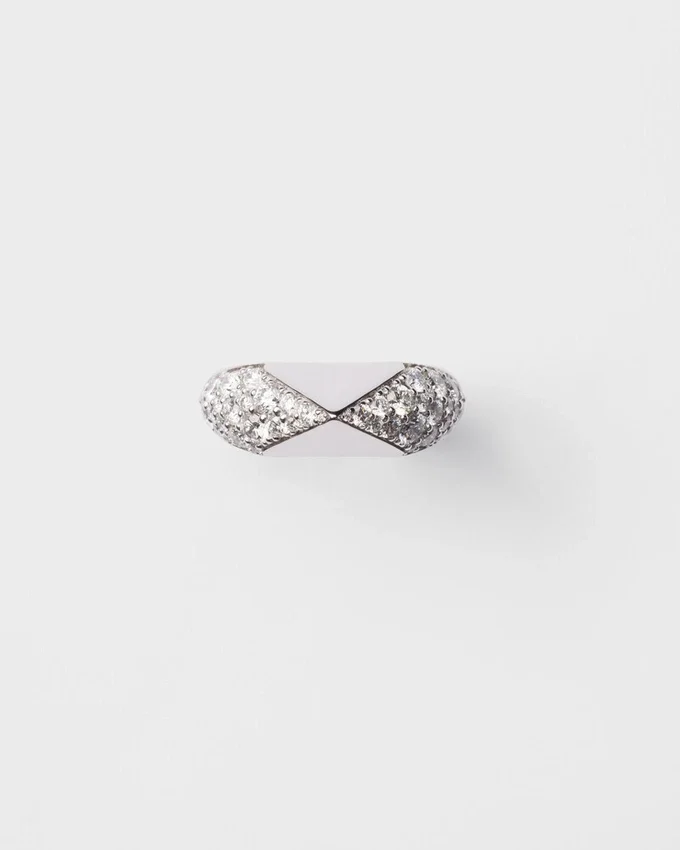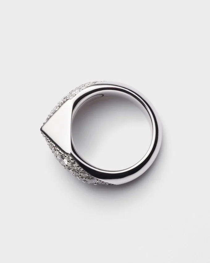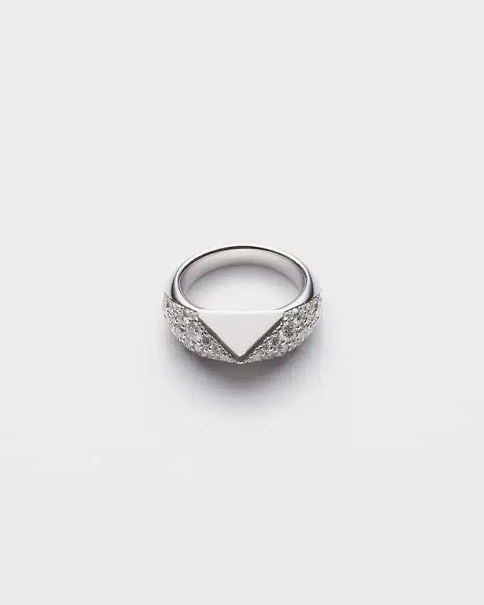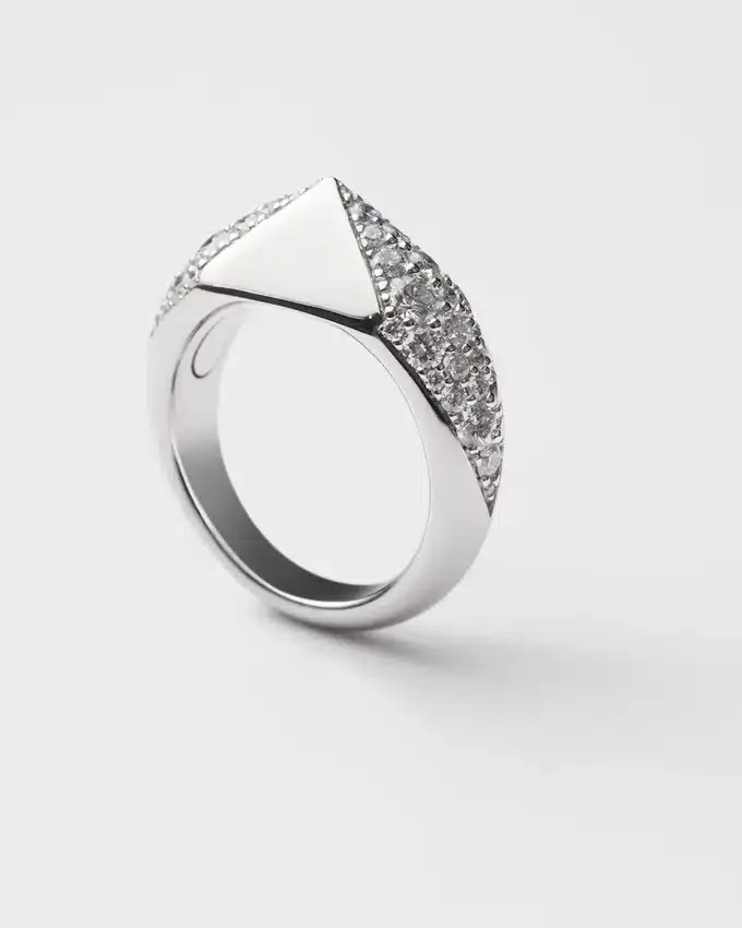 「エターナル ゴールド」コレクションは、原型的なフォルムと永遠のシンボルとの対話を紡ぎ出します。Prada Triangleという象徴的な幾何学的な形が、ダイヤモンドのパヴェで縁取られたこのホワイトゴールドのリングの中心的要素となっています。大胆で立体的なラインが、現代的かつ個性的なジュエリーを生み出し、革新と卓越した職人技の相互作用を表現しています。 (18K) ダイヤモンド付き