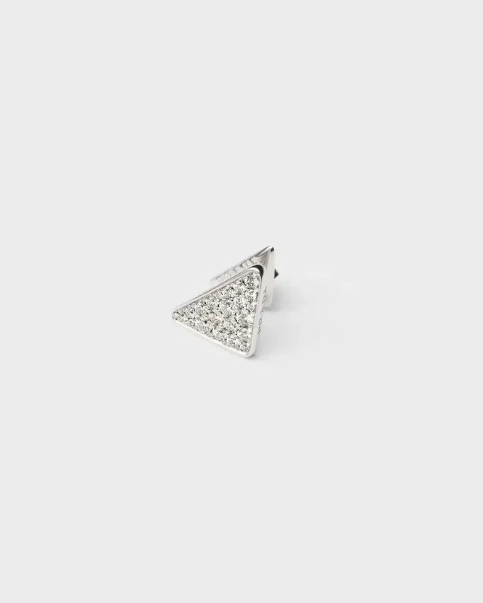 絶えず進化を続けるシンボルである「トライアングル」は、Pradaの二面性と型破りな精神を体現し、常に新しく驚くべき解釈を生み出しています。 1913年にマリオ・プラダによって初めて導入された象徴的なトライアングルが、リサイクルホワイトゴールドで作られたこのシングルイヤリングのシルエットに蘇ります。現代的なラインを持つこのジュエリーは、パヴァダイヤモンドで装飾されています。異なるサイズの石を新しいパターンで組み合わせる革新的な技術により、きらめく光のユニークな効果を生み出しています。