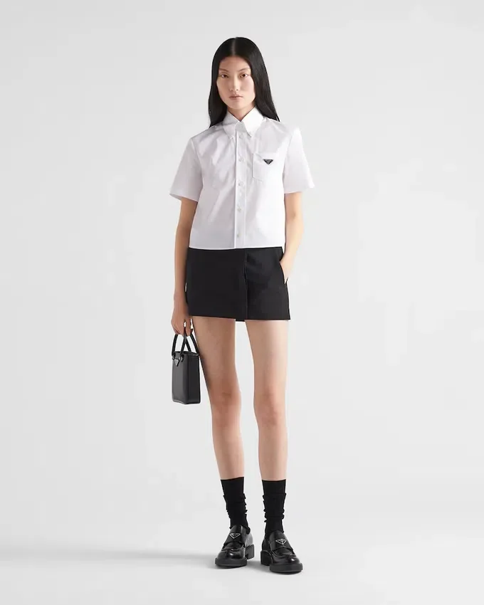 モダンな魅力を備えたミニマルなデザインが特徴の、ややクロップド丈のポプリンシャツです。ボタンダウンカラーと半袖の洗練されたスタイルに、エナメル加工された金属製の三角ロゴがあしらわれています。