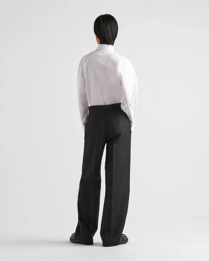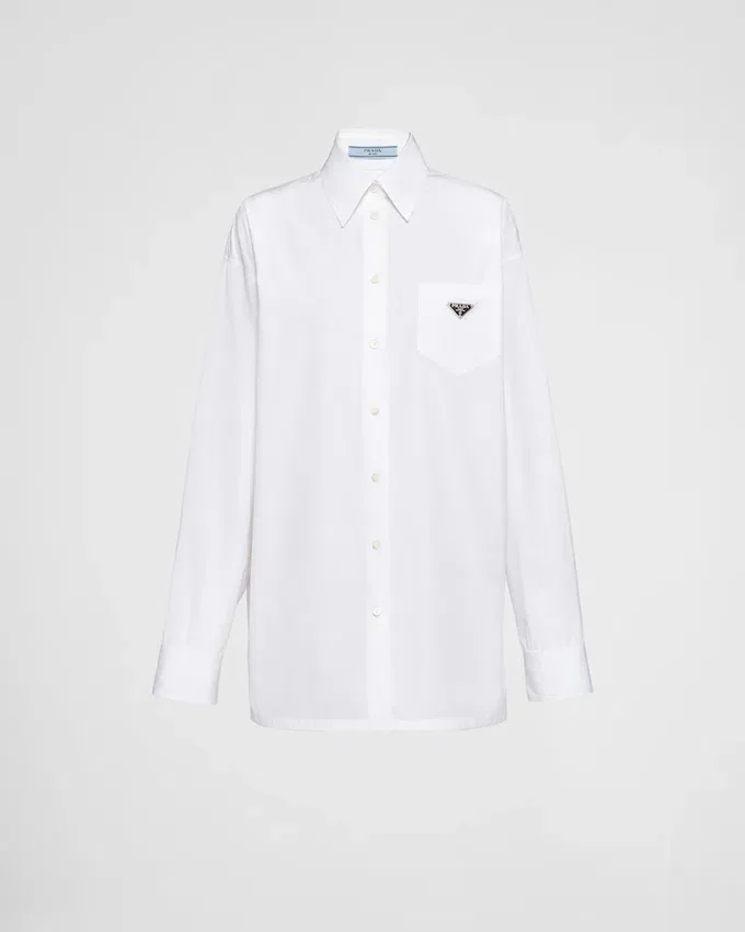 このポプリン素材のスタイルは、クラシックなメンズシャツをモダンでフェミニンな視点で再解釈したものです。洗練されたディテールが施され、エナメル加工されたメタル製トライアングルロゴがアクセントになっています。