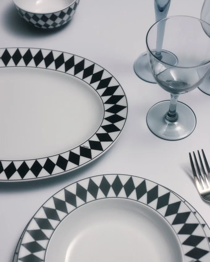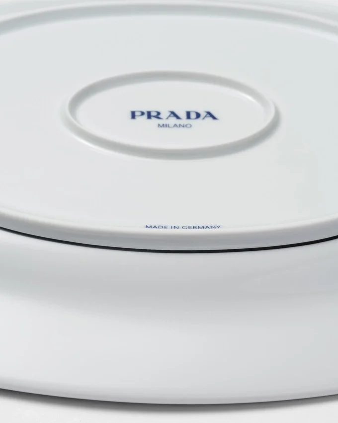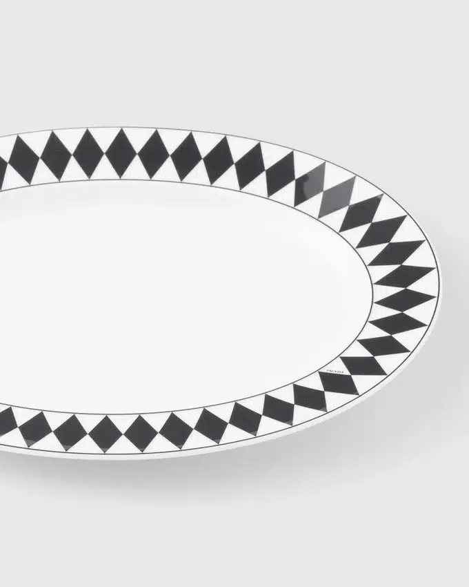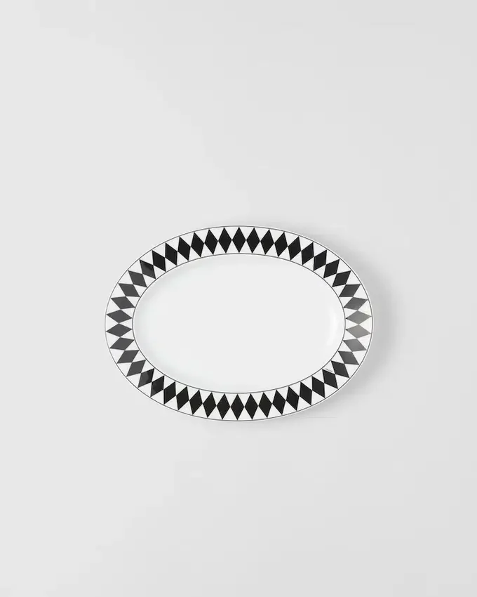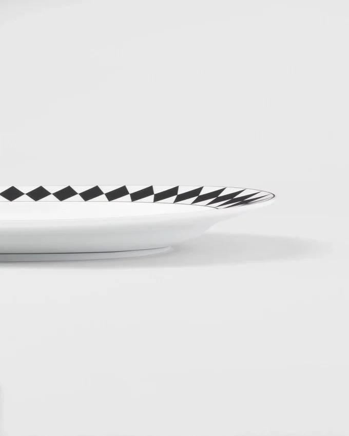 ミラノのヴィットーリオ・エマヌエーレ2世GalleriaにあるPradaの歴史ある店舗の白黒大理石の床からインスピレーションを得た、象徴的なチェッカーボード柄がこの楕円形のサービングプレートを彩ります。最高級の磁器で作られたエレガントなデザインは、食卓にモダンで洗練された雰囲気を添えます。