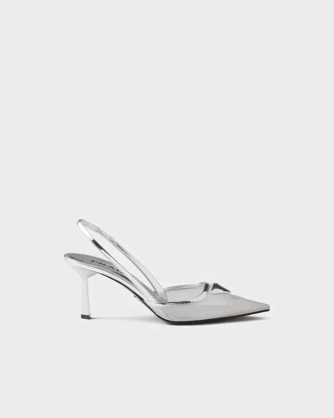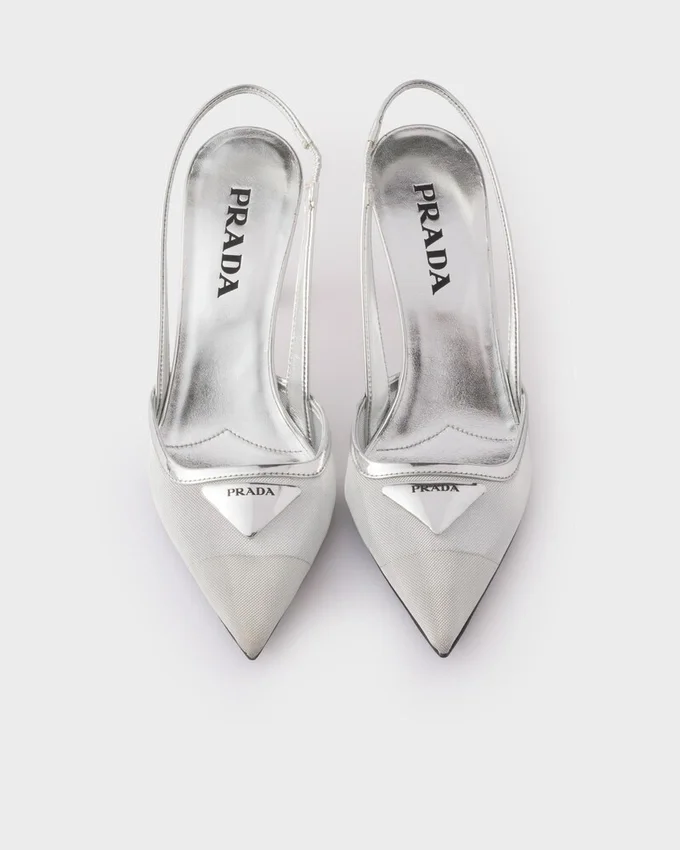 時代を超えたシルエットが、現代的な趣きを持つ新素材で再解釈されました。メッシュ生地にメタリックレザーのディテールを施したこのスリングバックパンプスは、象徴的なトライアングルから着想を得た幾何学的な形状のヒールが特徴です。