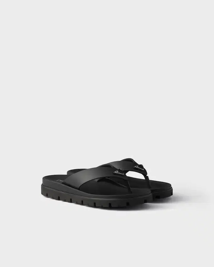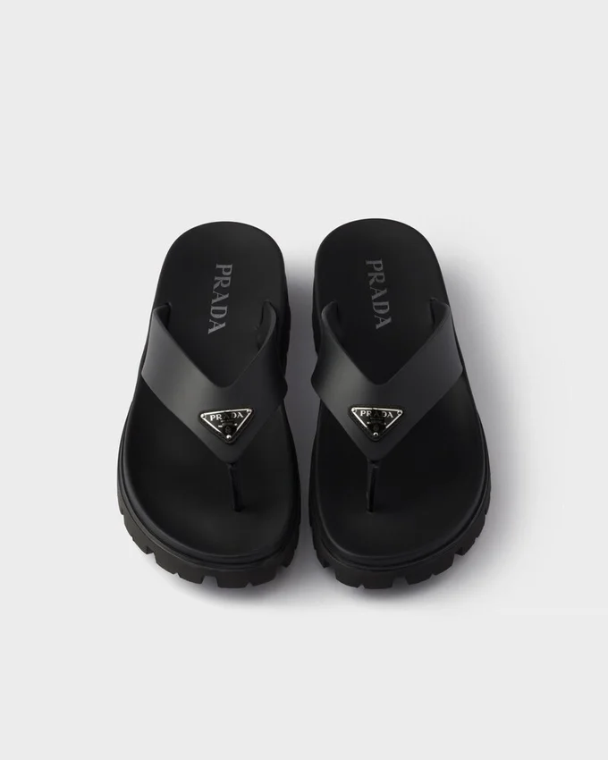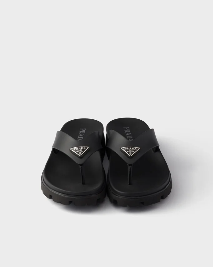 このラバー製トングサンダルは、洗練されたディテールを備えた現代的なシルエットが特徴です。象徴的なエナメル加工のメタルトライアングルロゴがアクセントとなり、ラグトレッドを施したラバーソールがスポーティーな印象を添えています。