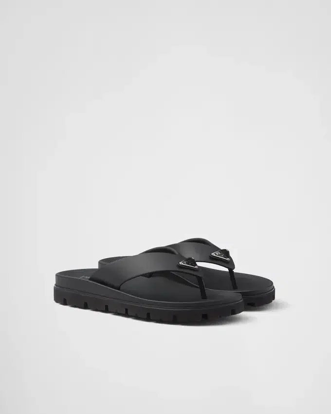 このラバー製トングサンダルは、洗練されたディテールを備えたモダンなシルエットが特徴です。象徴的なエナメル加工のメタルトライアングルロゴがアクセントとなり、ラグトレッド付きのラバーソールがスポーティーな印象を加えています。