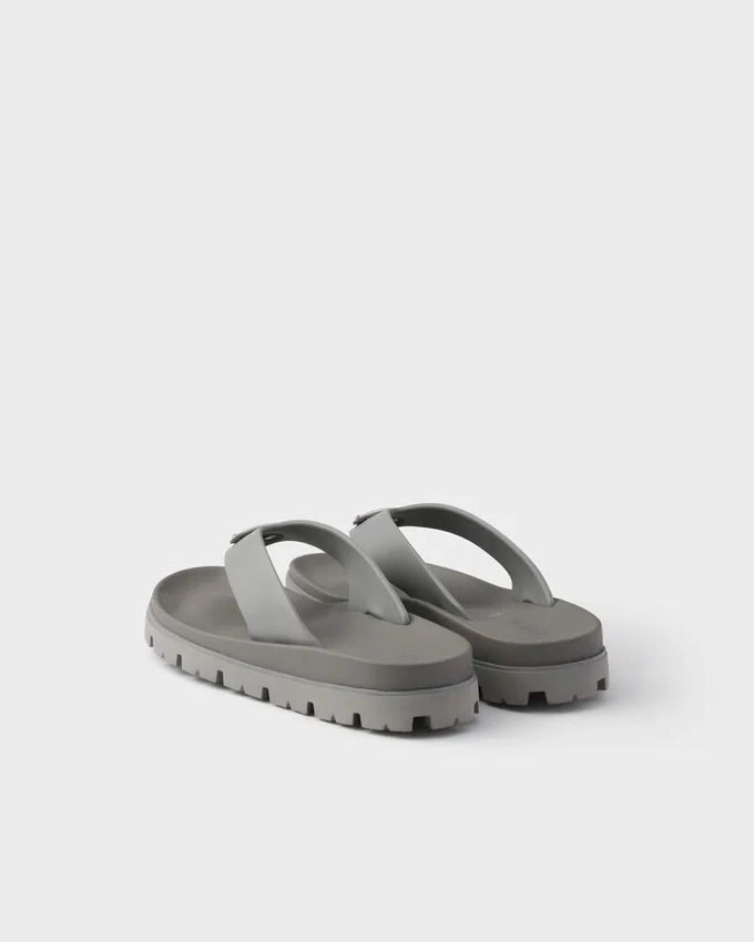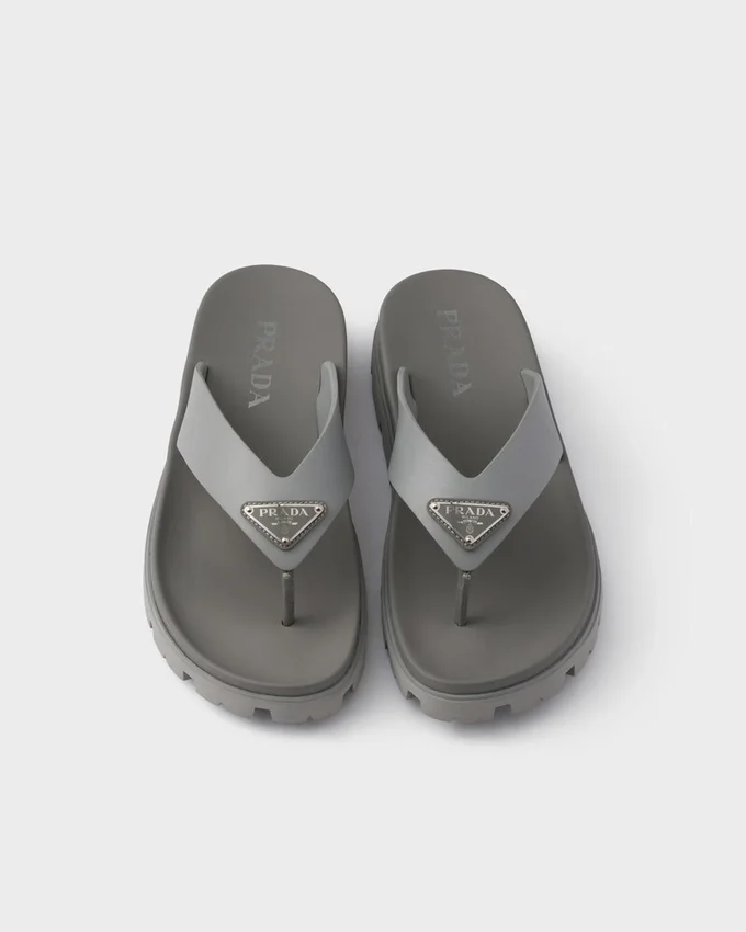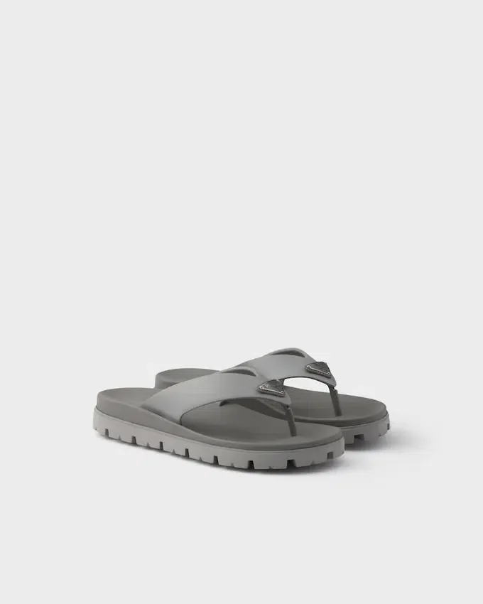 このラバー製トングサンダルは、洗練されたディテールを備えたモダンなシルエットが特徴です。象徴的なエナメル加工のメタルトライアングルロゴがアクセントとなり、ラグトレッド付きのラバーソールがスポーティーな印象を加えています。
