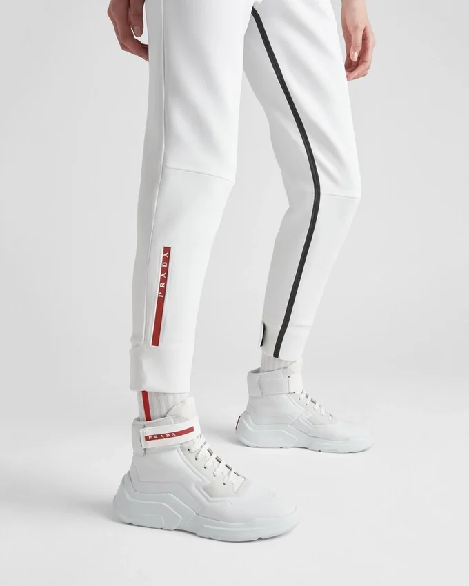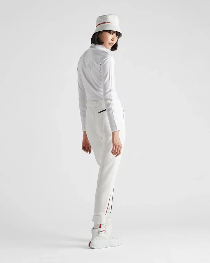 スポーティでありながら洗練されたストレートカットのパンツは、リサイクルされたテクニカルファブリックを使用しています。伸縮性のあるウエストバンドや、防水性を高める脚部の内側に施されたヒートシールテープの縫い目など、テクニカルなディテールが特徴的です。象徴的なプラダ リネア・ロッサのロゴが装飾され、アイコニックなアクセントを添えています。