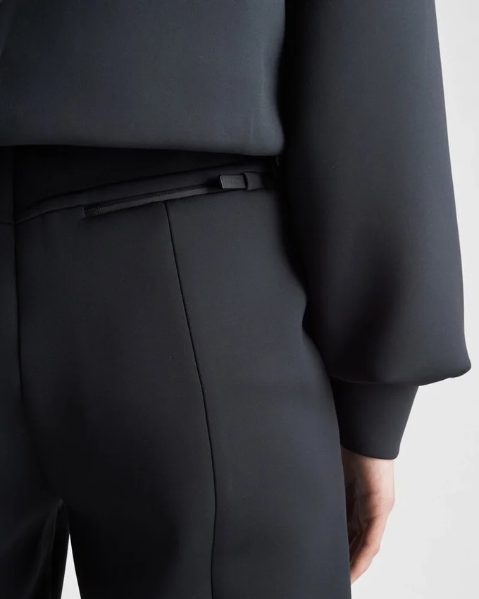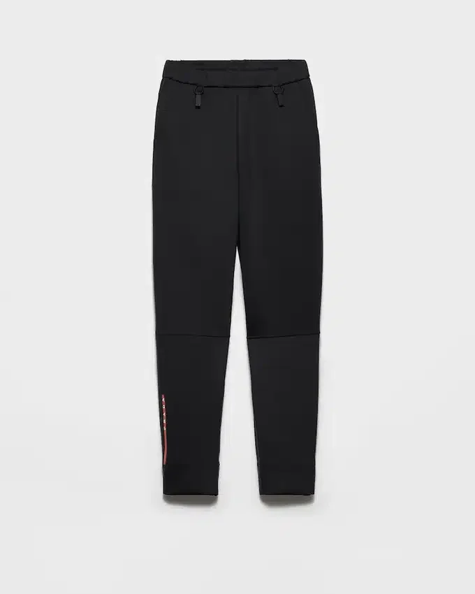 スポーティでありながら洗練されたストレートカットのパンツは、リサイクルされたテクニカルファブリックを使用しています。伸縮性のあるウエストバンドや、防水性を高める脚部の内側に施されたヒートシールテープの縫い目など、テクニカルなディテールが特徴的です。象徴的なプラダ リネア・ロッサのロゴが装飾され、アイコニックなアクセントを添えています。