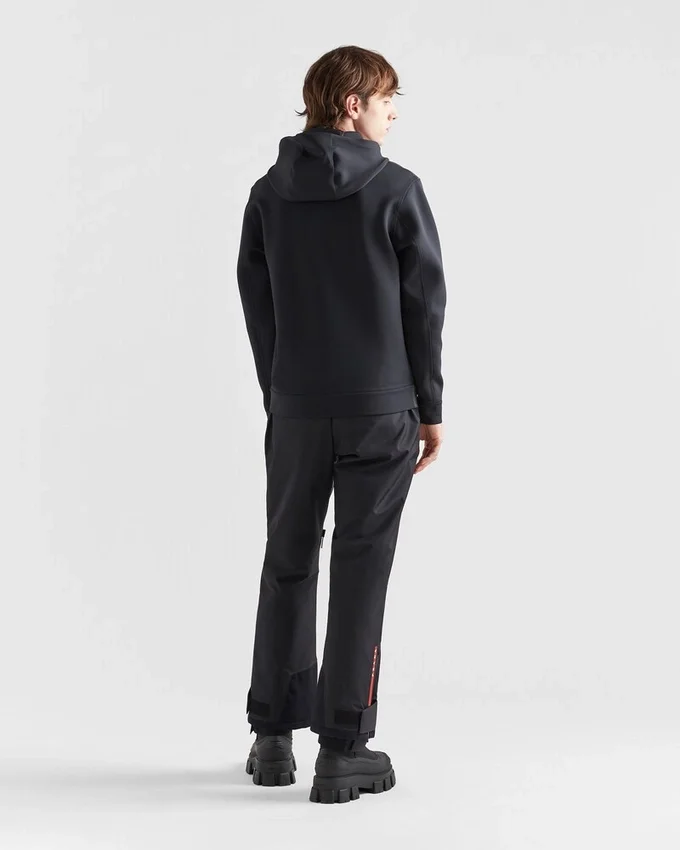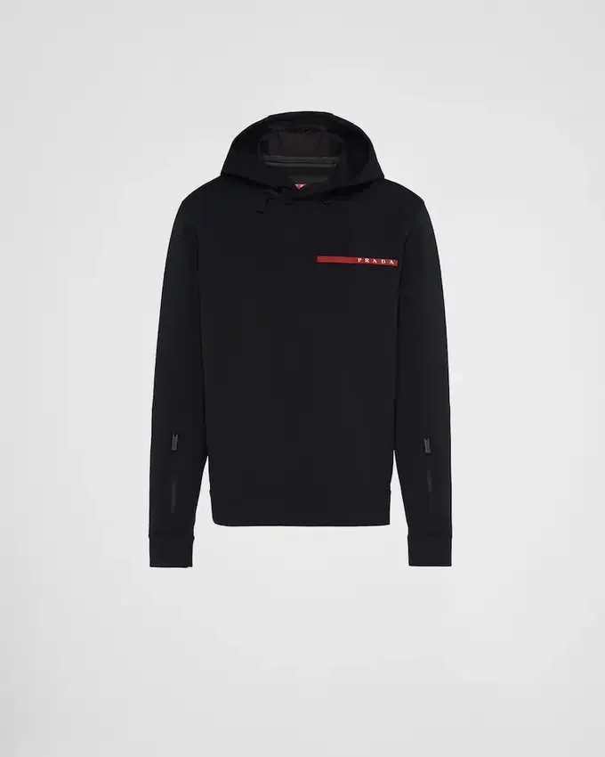 リサイクルポリエステル繊維から作られたテクニカルファブリック、ダブルジャージーを使用したこのボックスシルエットのフーディーは、スポーツにインスパイアされたディテールがスタイルを際立たせています。 フード付きで長袖のデザインが特徴のこのアイテムは、袖にコントラストカラーのヒートシールテープポケット、フロントにはラテックス製のロゴバッジがあしらわれています。