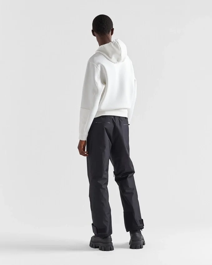リサイクルポリエステル繊維から作られたテクニカル素材、ダブルジャージーを使用したこのボックスシルエットのフーディは、スポーツからインスパイアされたディテールがスタイルを際立たせています。