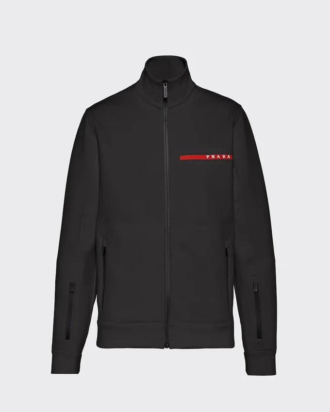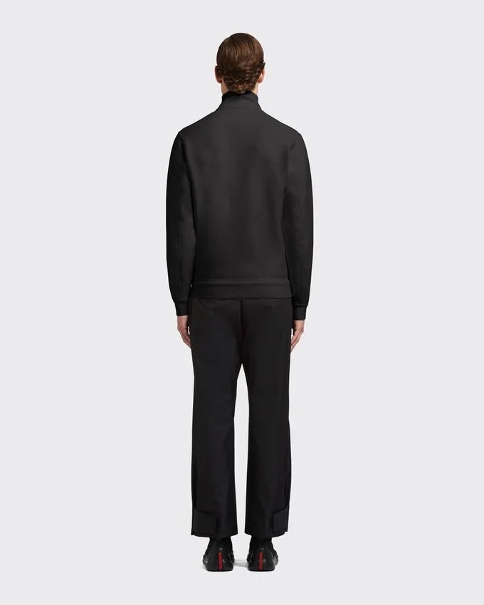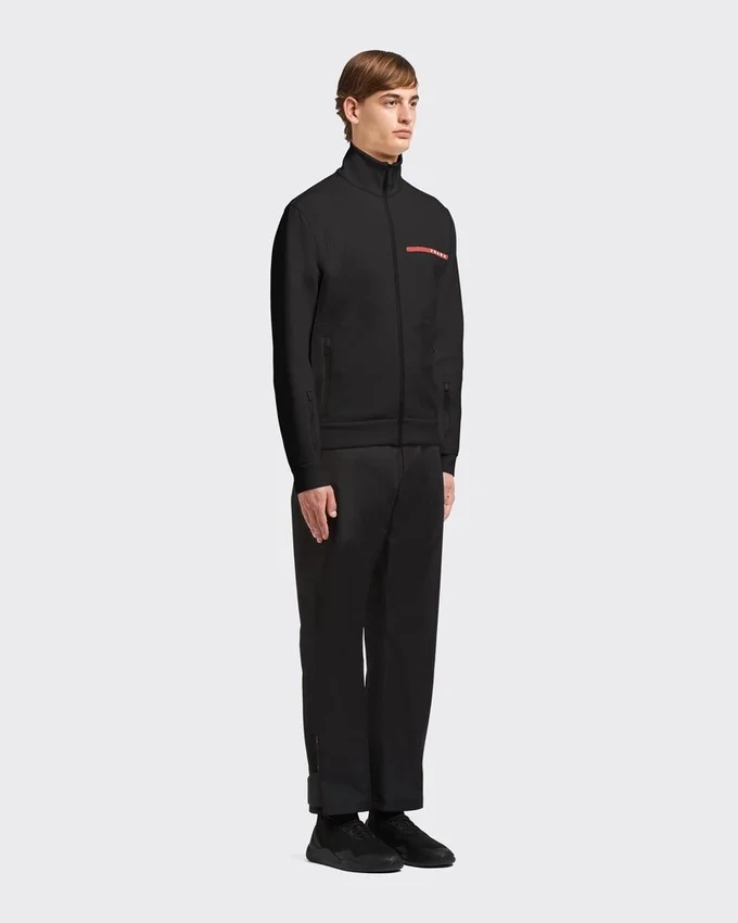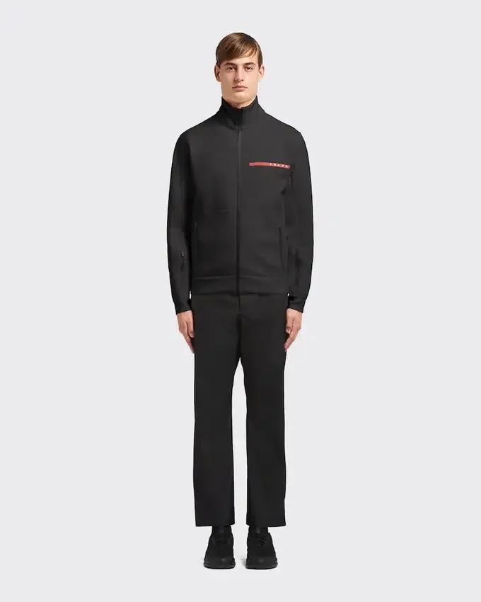 リサイクルポリエステル糸を使用したダブルウィーブ・テクニカルファブリック「ダブル・テクニカル・ジャージー」で作られた、フロントジッパー付きのこのスウェットジャケットのデザインは、スポーティなインスピレーションが際立っています。ヒートシールテープによって服のボックスシルエットが強調され、裾と袖口のフリースインサートがアクセントを加えています。