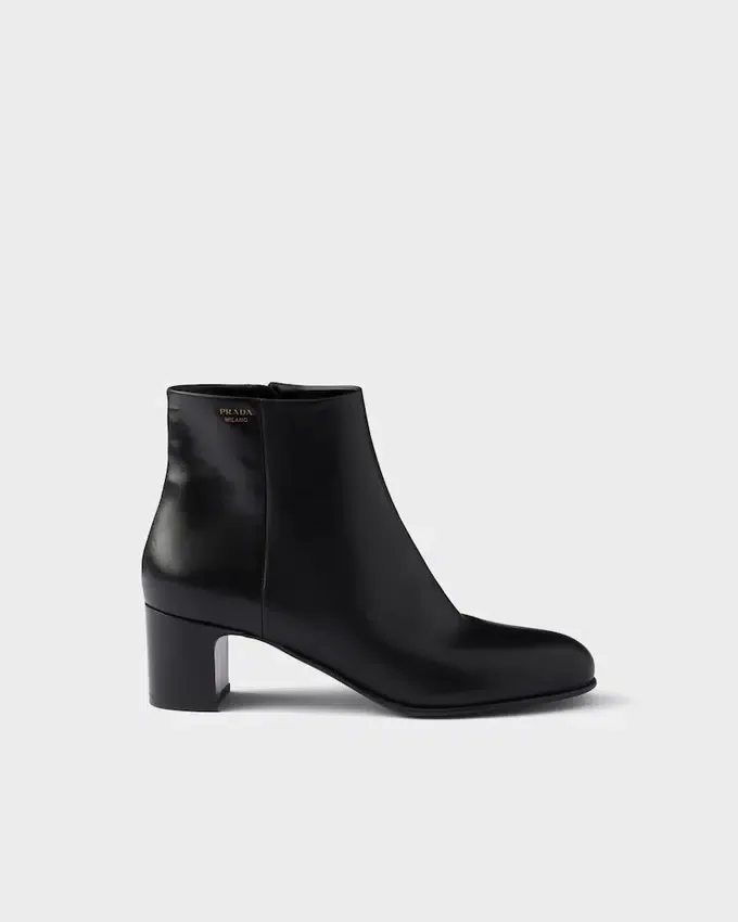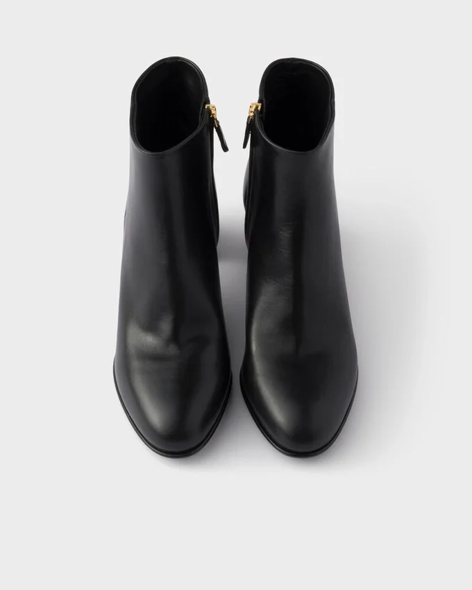 直線的なシンプルさが際立つこのレザーブーティは、汎用性が高く、時代を超えたフットウェアです。