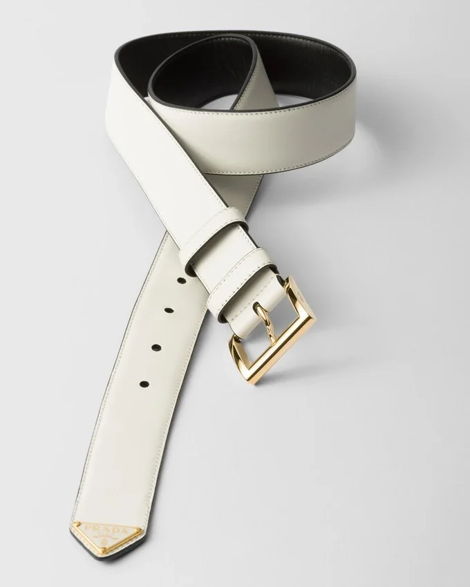 このレザーベルトの先端には、1913年にマリオ・Pradaがデザインしたトランクに初めて登場した、象徴的なエナメル加工メタル製トライアングルロゴがあしらわれています。