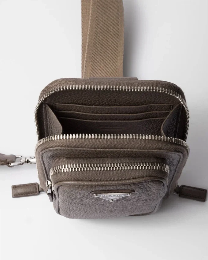 この多機能でモダンなスマートフォンケースは、洗練されたデザインのレザー製です。ジッパーポケットと調節可能なショルダーストラップがデザインを引き立て、エナメル加工された金属製の三角ロゴがあしらわれています。