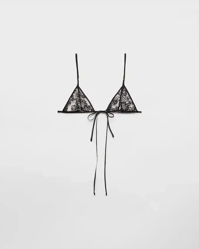 この洗練されたトライアングルブラは、ミニマルなラインとレースの繊細で上品な美しさを融合させたデザインです。