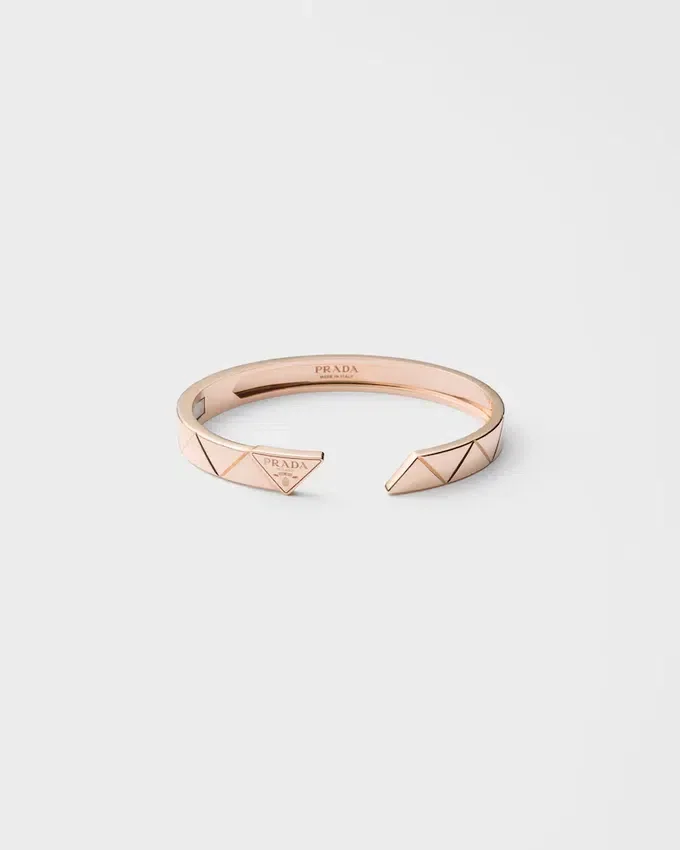 リサイクルローズゴールドを使用したこのブレスレットは、クラシックなオーバルバングルを現代的に再解釈したものです。わずかに浮き彫りされたモチーフで装飾されたこのデザインは、1913年にマリオ・プラダの旅行用トランクに刻印として初めて登場した、ブランドを象徴する幾何学模様「トライアングル」を彷彿とさせます。 隠しヒンジ留め具を備えたこのエレガントなブレスレットは、好奇心、革新、創造性に導かれたPradaの型破りな精神を際立たせ、職人の熟練の技が詰まったファインジュエリーコレクションを生み出しています。