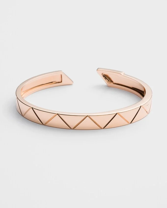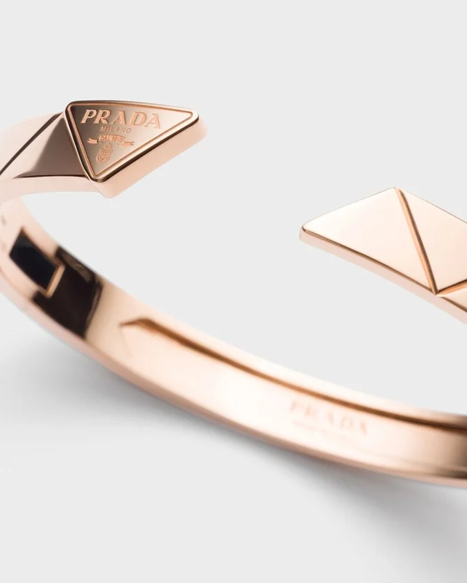 リサイクルローズゴールドを使用したこのブレスレットは、クラシックなオーバルバングルを現代的に再解釈したものです。わずかにエンボス加工されたモチーフで装飾されたこのスタイルは、1913年にマリオ・Pradaの旅行用トランクに刻印として初めて登場した、ブランドの象徴的な幾何学模様である「トライアングル」を彷彿とさせます。 隠しヒンジ留め具を備えたこのエレガントなブレスレットは、好奇心、革新、創造性に導かれたPradaの型破りな精神を際立たせ、職人の熟練の技が詰まったファインジュエリーコレクションを生み出しています。